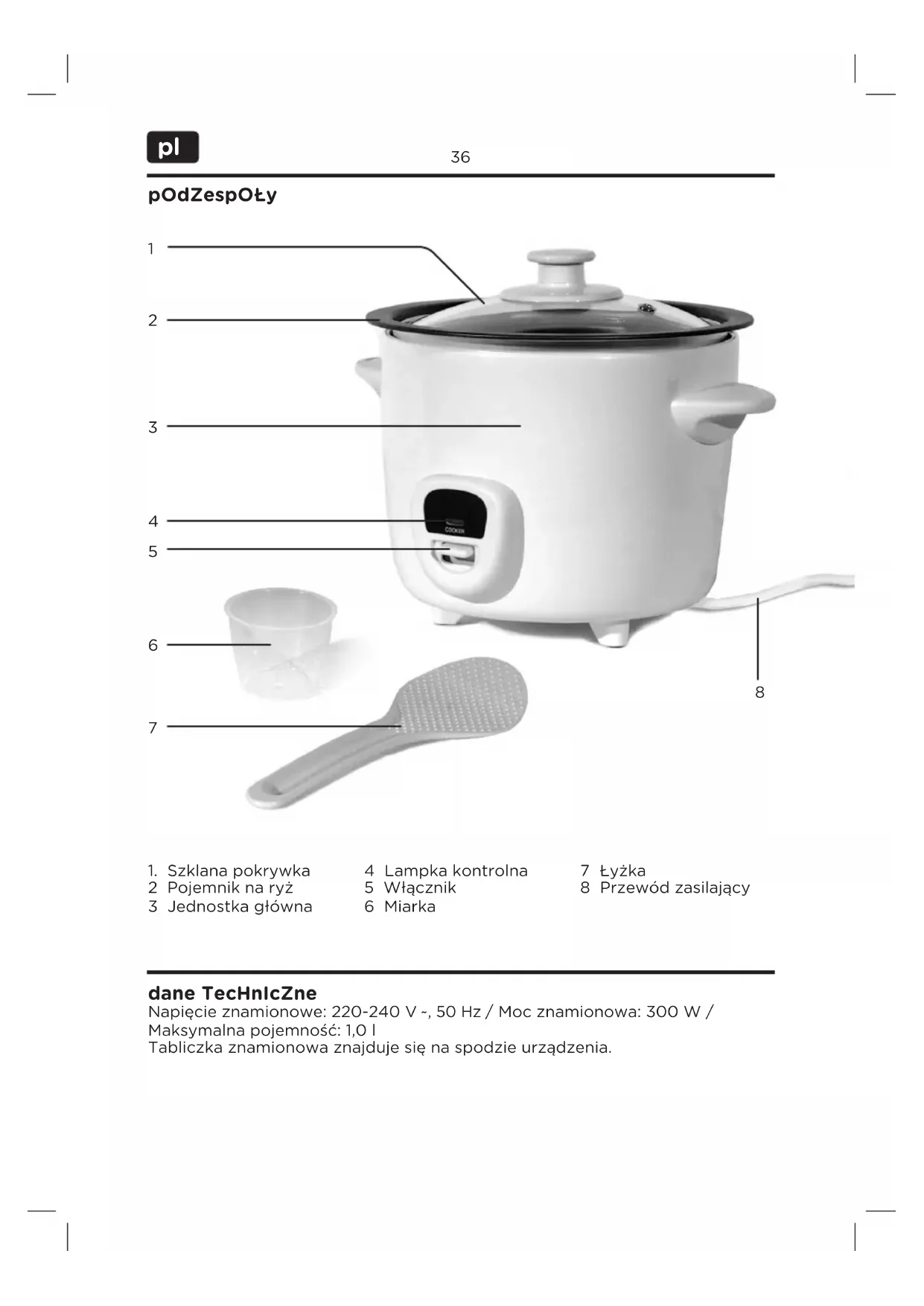 2 Pojemnik na ryż 3 Jednostka główna 4 Lampka kontrolna 5 Włącznik 6 Miarka 7 Łyżka 8 Przewód zasilający