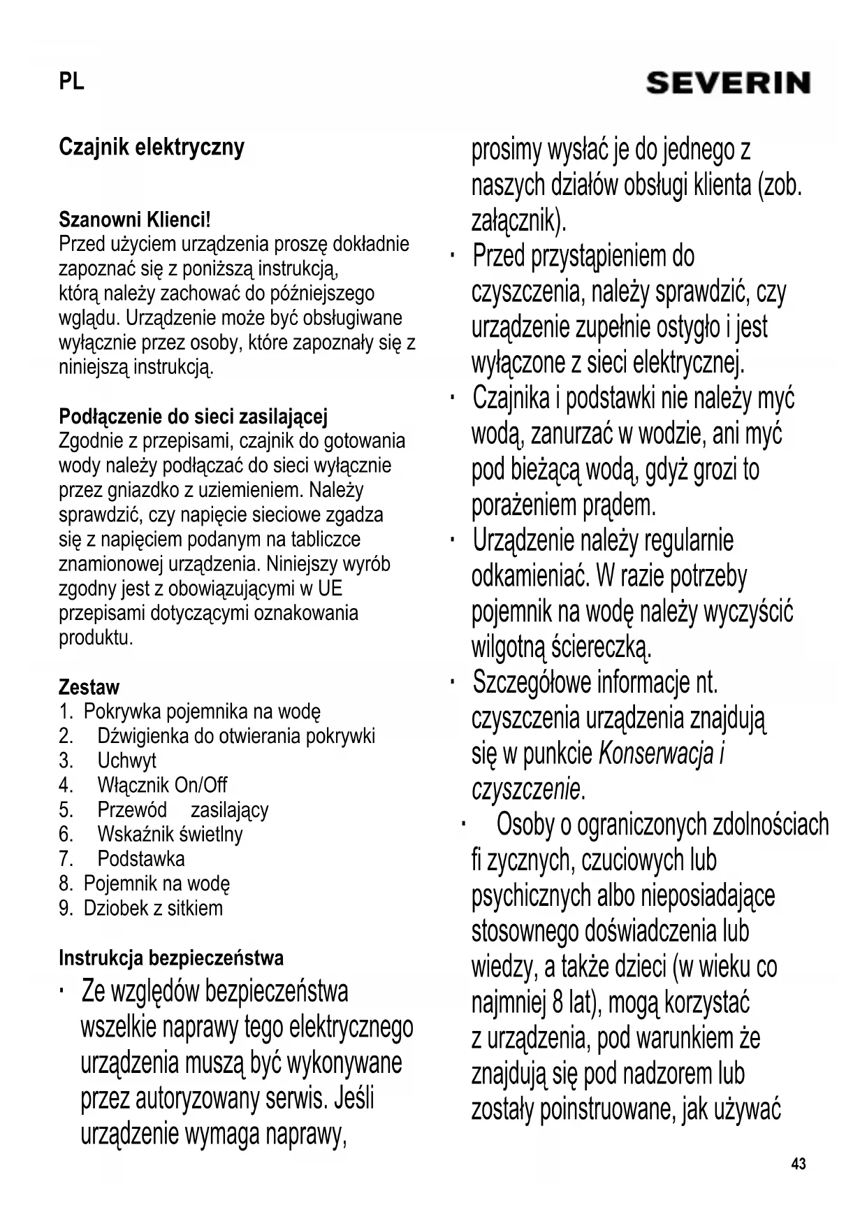 Instrukcja bezpieczeństwa ∙ Ze względów bezpieczeństwa wszelkie naprawy tego elektrycznego urządzenia muszą być wykonywane przez autoryzowany serwis. Jeśli urządzenie wymaga naprawy, prosimy wysłać je do jednego z naszych działów obsługi klienta (zob. załącznik). ∙ Przed przystąpieniem do czyszczenia, należy sprawdzić, czy urządzenie zupełnie ostygło i jest wyłączone z sieci elektrycznej. ∙ Czajnika i podstawki nie należy myć wodą, zanurzać w wodzie, ani myć pod bieżącą wodą, gdyż grozi to porażeniem prądem. ∙ Urządzenie należy regularnie odkamieniać. W razie potrzeby pojemnik na wodę należy wyczyścić wilgotn ą ściereczką. ∙ Szczegółowe informacje nt. czyszczenia urządzenia znajdują się w punkcie Konserwacja i czyszczenie. ∙ Osoby o ograniczonych zdolnościach fi zycznych, czuciowych lub psychicznych albo nieposiadające stosownego doświadczenia lub wiedzy, a także dzieci (w wieku co najmniej 8 lat), mogą korzystać z urządzenia, pod warunkiem że znajdują się pod nadzorem lub zostały poinstruowane, jak używać PL44 urządzenia i są w pełni świadome wszelkich zagrożeń i wymaganych środków ostrożności. ∙ Nie dopuszczać do używania urządzenia jako zabawki przez dzieci. ∙ Nie wolno pozwalać dzieciom na wykonywanie jakichkolwiek prac związanych bezpośrednio z konserwacją lub czyszczeniem urządzenia, a jeżeli już, to dziecko musi mieć co najmniej 8 lat i być nadzorowane przez osobę dorosłą. ∙ Nie dopuszczać do urządzenia i jego przewodu zasilającego dzieci w wieku poniżej 8 lat. ∙ Urządzenie przeznaczone jest do zastosowań domowych lub podobnych, jak np. w - sklepach, biurach i innych podobnych miejscach pracy – przez pracowników; - agroturystyce; - hotelach, motelach itp. oraz innych podobnych miejscach zakwaterowania (przez klientów); - pensjonatach. ∙ Korpus urządzenia rozgrzewa się do wysokiej temperatury w trakcie pracy i pozostaje gorący przez jakiś czas po jej zakończeniu. ∙ Nie należy zostawiać włączonego czajnika bez nadzoru. Używać wyłącznie czystej wody i uważać, aby przy napełnianiu pojemnika poziom wody zawsze znajdował się pomiędzy oznaczeniami: minimum (0,5 l) / maksimum (1.0 l). Przepełnienie pojemnika grozi wylaniem się wrzątku z urządzenia. ∙ Należy także uważać, aby nie oparzyć się gorącą parą wydobywającą się podczas gotowania. Nie dotykać żadnych części urządzenia oprócz uchwytu. ∙ Uwaga! Podczas gotowania a także wylewania gorą cej wody, pokrywka pojemnika na wodę musi być zamknięta. ∙ Korzystając z czajnika należy używać wyłącznie dostarczonej wraz z nim podstawki. ∙ Nie wolno zdejmować pojemnika na wodę z podstawki (lub wymieniać go) kiedy urządzenie jest włączone. ∙ Złącza elektryczne znajdujące się45 w podstawce należy bezwzględnie chronić przed jakimkolwiek kontaktem z wodą. ∙ Uwaga: Nieprawidłowe użytkowanie urządzenia może doprowadzić do poważnych obrażeń ciała. ∙ Uwaga: Nie pozwalać, aby dzieci miały dostęp do elementów opakowania, ponieważ może to doprowadzić do niebezpiecznego wypadku, np. uduszenia. ∙ Przed użyciem urządzenia należy dokładnie sprawdzić, czy jego korpus i wszystkie elementy czynnościowe są sprawne i nie noszą śladów uszkodzenia. Jeżeli urządzenie np. spadło na twardą powierzchnię albo przewód zasilający został narażony na zbyt silne szarpnięcie, nie nadaje się ono do dalszego użytku: nawet najmniejsza, niewidoczna usterka powstała z tego powodu, może mieć ujemny wpływ na działanie urządzenia i bezpieczeństwo użytkownika. ∙ Urządzenie musi zawsze być ustawione na równej i stabilnej powierzchni, odpornej na wysokie temperatury. ∙ Nie włączać urządzenia, kiedy znajduje się ono pod wiszącą szafką, półką lub innym podobnym przedmiotem; istnieje ryzyko gromadzenia się nadmiernej ilości pary. ∙ Należy uważać, aby przewód zasilający i korpus czajnika nie wchodziły w kontakt z płomieniami lub gorącymi powierzchniami, np. płytą kuchenki lub grzejną. ∙ Przewód zasilający nie powinien swobodnie zwisać i należy go zabezpieczyć przed stykaniem się z rozgrzanymi częściami urządzenia. ∙ Wtyczkę należy wyjąć z gniazdka elektrycznego: - po zakończeniu pracy - w przypadku awarii urządzenia - przed przystąpieniem do czyszczenia urządzenia. ∙ Za szkody wynikłe z nieprawidłowego używania sprzętu lub użytkowania niezgodnego z instrukcją obsługi odpowiedzialność ponosi wyłącznie użytkownik. Termiczny wyłącznik bezpieczeństwa Fabrycznie ustawiony termiczny wyłącznik bezpieczeństwa chroni grzałkę przed przegrzaniem się, gdyby urządzenie zostało włączone bez wody albo kiedy płytka grzewcza pokryje się kamieniem. Czajnik, który wyłączy się automatycznie sam należy pozostawić do całkowitego ostygnięcia, a jeśli przyczyną jest osad kamienia, należy go wyczyścić. Przed użyciem czajnika po raz pierwszy Ze względów higienicznych, pierwszą zagotowaną partię wody należy wylać. Gotowanie wody ∙ Zdjąć czajnik z podstawki. ∙ Nacisnąć dźwigienkę do otwierania pokrywki, aby otworzyć pokrywkę i napełnić pojemnik wodą do żądanego poziomu, między oznaczeniami Min (0,5 l) a Max (1,0 l). ∙ Zamknąć pokrywkę i ustawić czajnik na podstawce. ∙ W łożyć wtyczkę do gniazdka elektrycznego i nacisnąć włącznik On/Off. Zapali się wówczas lampka kontrolna. ∙ Rozpocznie się proces gotowania. Wbudowane parowe zabezpieczenie46 wyłączy urządzenie automatycznie po osiągnięciu punktu wrzenia. Lampka kontrolna zgaśnie. ∙ Aby przerwać proces gotowania, ustawić włącznik w pozycji Off. ∙ Zawsze zdejmij pojemnik z podstawy, kiedy chcesz wylać gotowaną wodę. ∙ Podczas wylewania gorącej wody należy uważać aby pokrywka dobrze przykrywała pojemnik i chroniła wydobywającą się gorącą parą. ∙ Po zakończe
