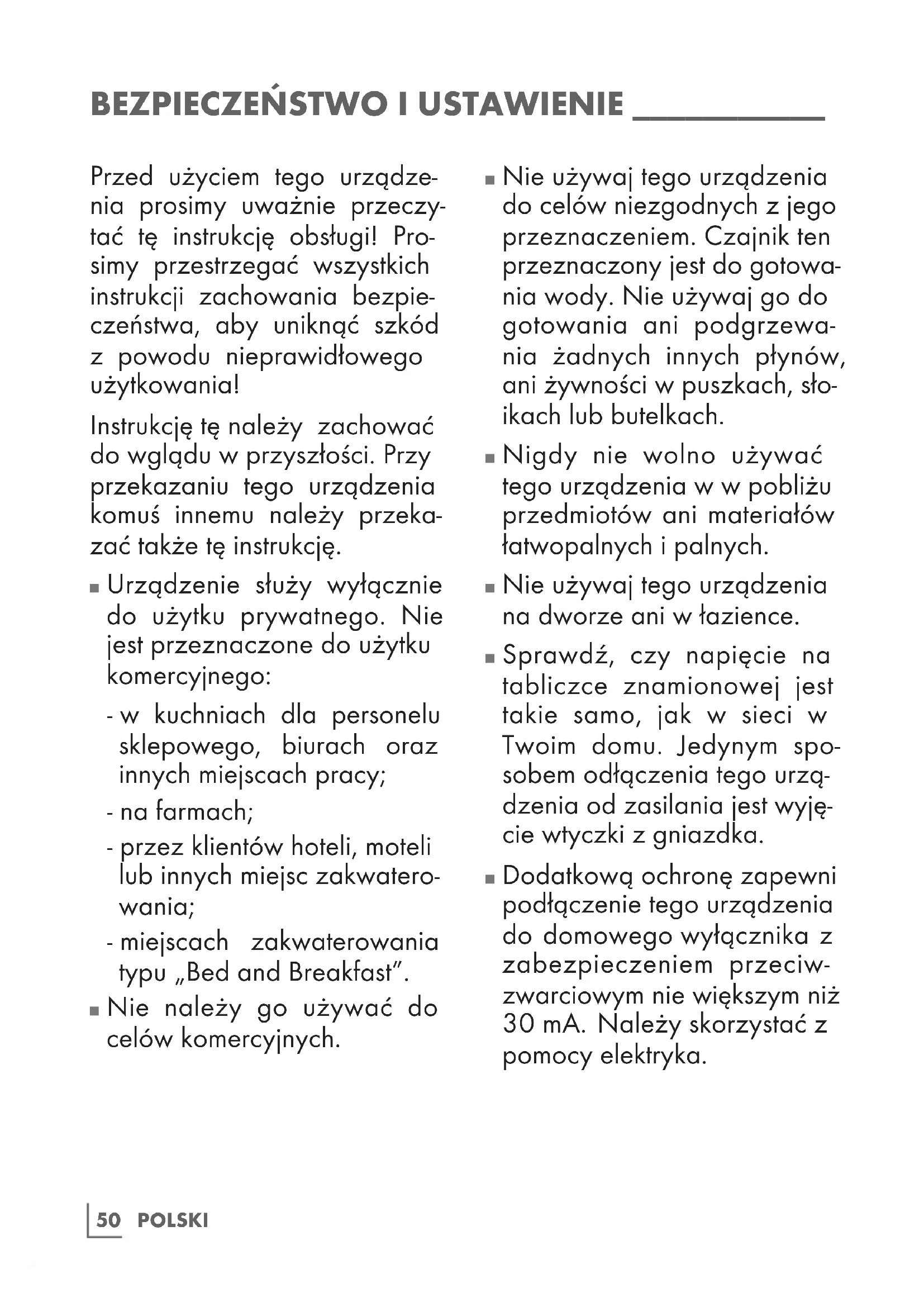 Nie używaj tego urządzenia do celów niezgodnych z jego przeznaczeniem. Czajnik ten przeznaczony jest do gotowa- nia wody. Nie używaj go do gotowania ani podgrzewa- nia żadnych innych płynów, ani żywności w puszkach, sło- ikach lub butelkach.