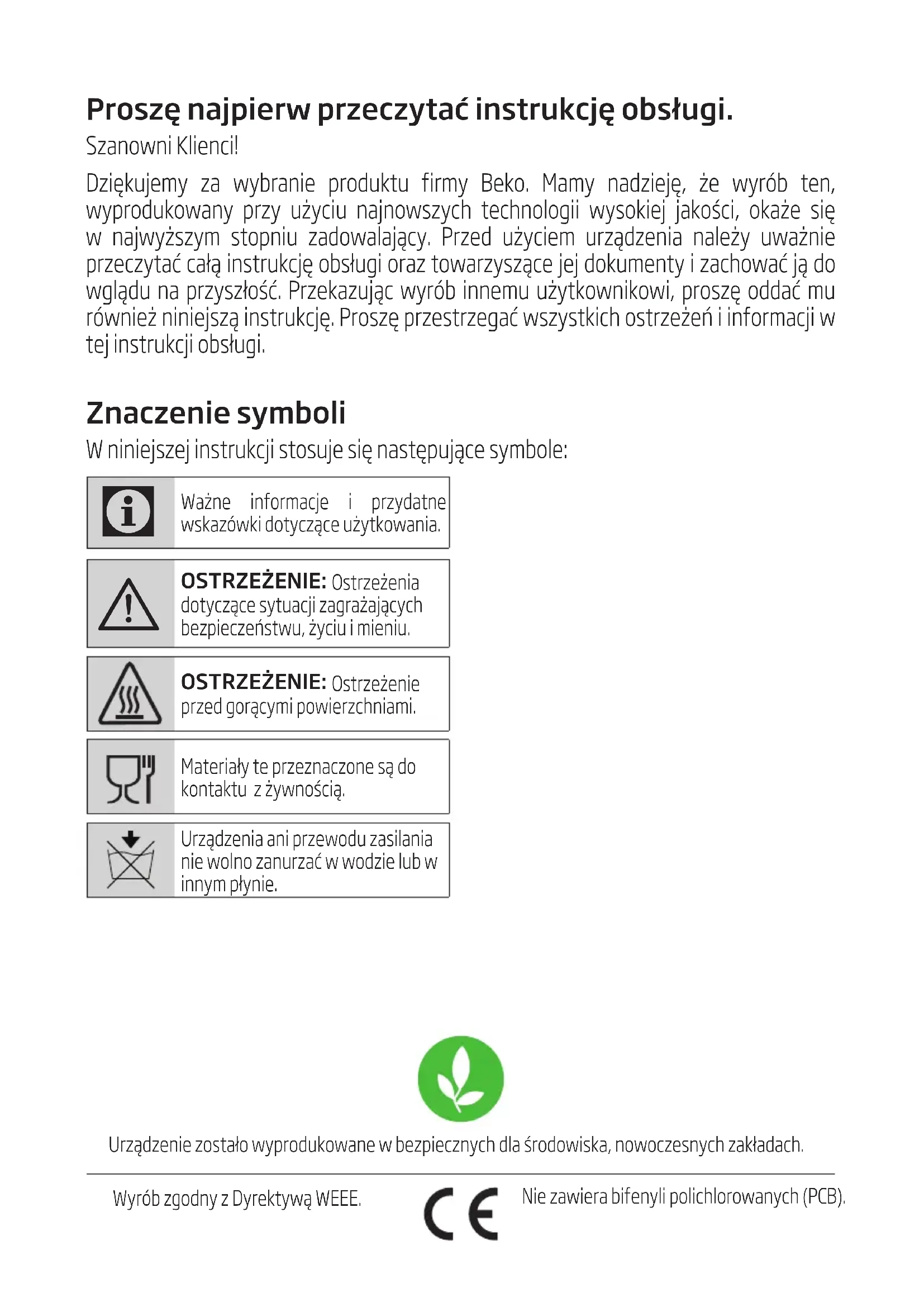 Proszę najpierw przeczytać instrukcję obsługi. Szanown Klenc! Dzękujemy za wybrane produktu frmy Beko. Mamy nadzeję, że wyrób ten, wyprodukowany przy użycu najnowszych technolog wysokej jakośc, okaże sę w najwyższym stopnu zadowalający. Przed użycem urządzena należy uważne przeczytać całą nstrukcję obsług oraz towarzyszące jej dokumenty zachować ją do wglądu na przyszłość. Przekazując wyrób nnemu użytkownkow, proszę oddać mu równeż nnejszą nstrukcję. Proszę przestrzegać wszystkch ostrzeżeń nformacj w tej nstrukcj obsług. Znaczenie symboli W nnejszej nstrukcj stosuje sę następujące symbole: