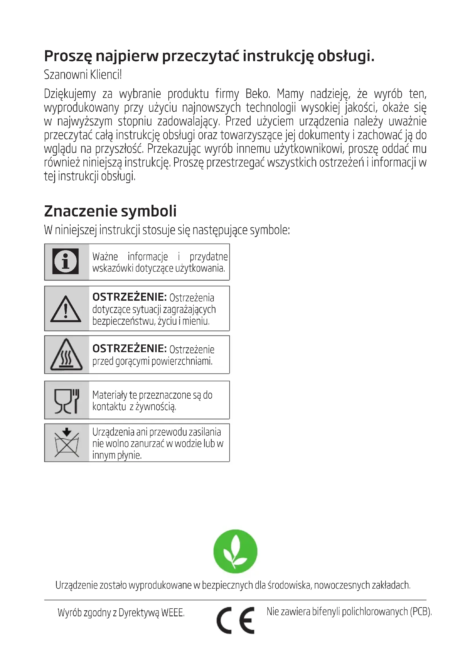 Proszę najpierw przeczytać instrukcję obsługi. Szanown Klenc! Dzękujemy za wybrane produktu frmy Beko. Mamy nadzeję, że wyrób ten, wyprodukowany przy użycu najnowszych technolog wysokej jakośc, okaże sę w najwyższym stopnu zadowalający. Przed użycem urządzena należy uważne przeczytać całą nstrukcję obsług oraz towarzyszące jej dokumenty zachować ją do wglądu na przyszłość. Przekazując wyrób nnemu użytkownkow, proszę oddać mu równeż nnejszą nstrukcję. Proszę przestrzegać wszystkch ostrzeżeń nformacj w tej nstrukcj obsług. Znaczenie symboli W nnejszej nstrukcj stosuje sę następujące symbole: