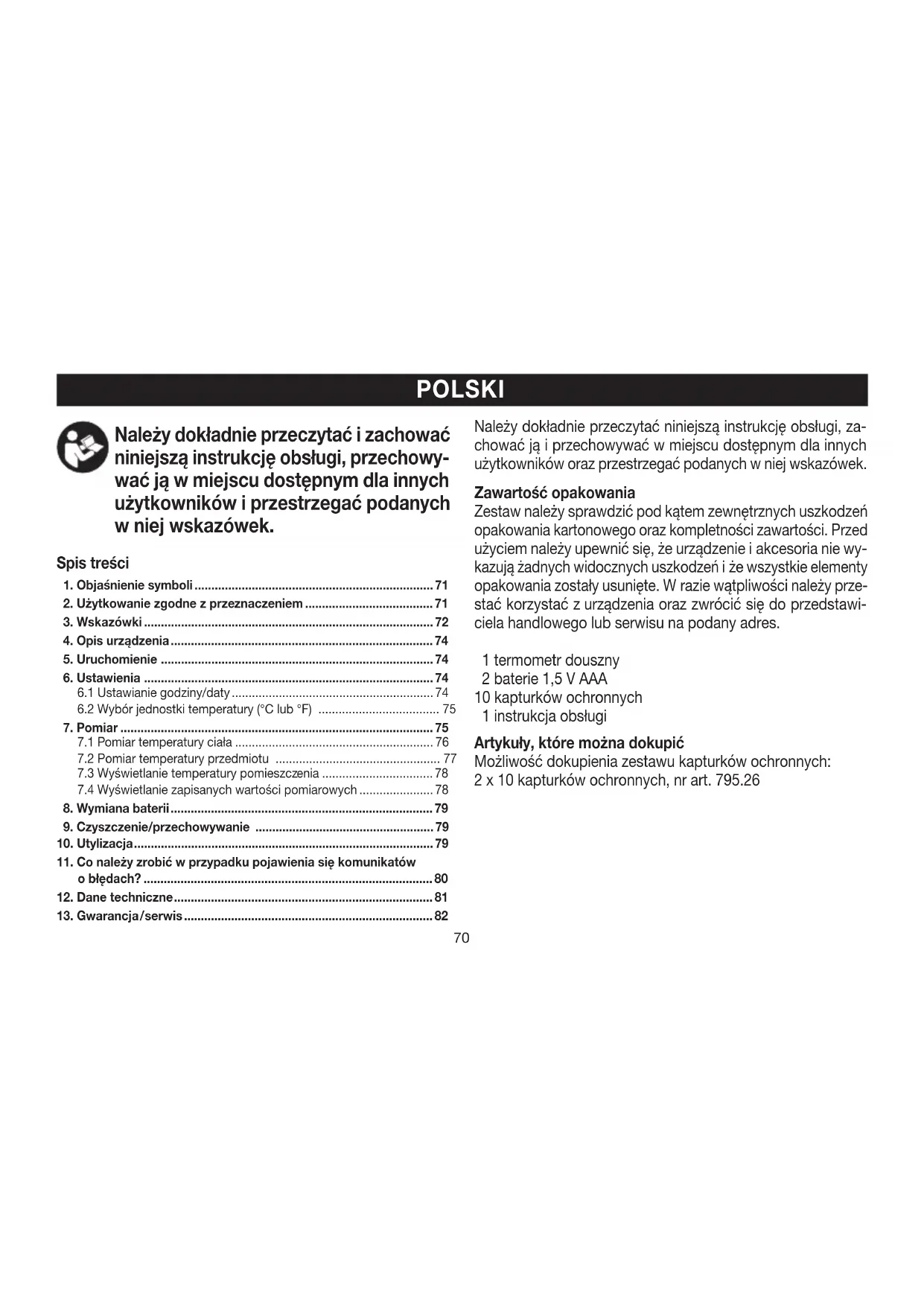 обслуживание Более подробная информация по гарантии/сервису нахо- дится в гарантийном/сервисном талоне, который входит в комплект поставки. Возможны ошибки иизменения70 POLSKI Należy dokładnie przeczytać i zachować niniejszą instrukcję obsługi, przechowy- wać ją w miejscu dostępnym dla innych użytkowników i przestrzegać podanych w niej wskazówek. Należy dokładnie przeczytać niniejszą instrukcję obsługi, za- chować ją i przechowywać w miejscu dostępnym dla innych użytkowników oraz przestrzegać podanych w niej wskazówek. Zawartość opakowania Zestaw należy sprawdzić pod kątem zewnętrznych uszkodzeń opakowania kartonowego oraz kompletności zawartości. Przed użyciem należy upewnić się, że urządzenie iakcesoria nie wy- kazują żadnych widocznych uszkodzeń iże wszystkie elementy opakowania zostały usunięte. Wrazie wątpliwości należy prze- stać korzystać zurządzenia oraz zwrócić się do przedstawi- ciela handlowego lub serwisu na podany adres. 1 termometr douszny 2 baterie 1,5 VAAA 10 kapturków ochronnych 1 instrukcja obsługi Artykuły, które można dokupić Możliwość dokupienia zestawu kapturków ochronnych: 2 x 10 kapturków ochronnych, nr art. 795.26