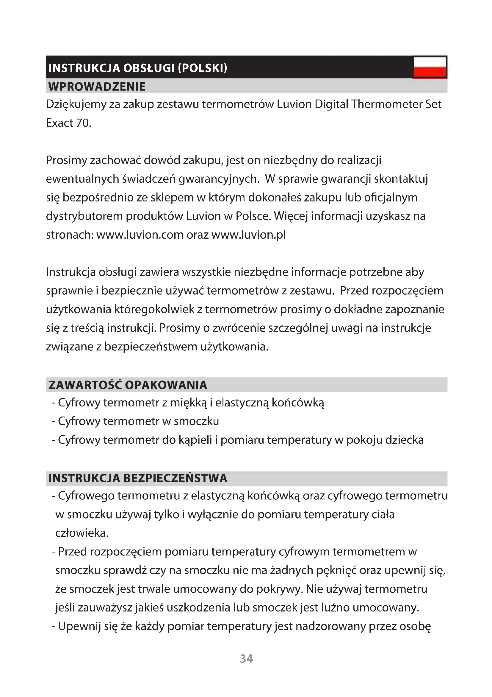 la tapa.34 INSTRUKCJA OBSŁUGI (POLSKI) WPROWADZENIE Dziękujemy za zakup zestawu termometrów Luvion Digital Thermometer Set Exact 70. Prosimy zachować dowód zakupu, jest on niezbędny do realizacji ewentualnych świadczeń gwarancyjnych. W sprawie gwarancji skontaktuj się bezpośrednio ze sklepem w którym dokonałeś zakupu lub ocjalnym dystrybutorem produktów Luvion w Polsce. Więcej informacji uzyskasz na stronach: www.luvion.com oraz www.luvion.pl Instrukcja obsługi zawiera wszystkie niezbędne informacje potrzebne aby sprawnie i bezpiecznie używać termometrów z zestawu. Przed rozpoczęciem użytkowania któregokolwiek z termometrów prosimy o dokładne zapoznanie się z treścią instrukcji. Prosimy o zwrócenie szczególnej uwagi na instrukcje związane z bezpieczeństwem użytkowania. ZAWARTOŚĆ OPAKOWANIA - Cyfrowy termometr z miękką i elastyczną końcówką - Cyfrowy termometr w smoczku - Cyfrowy termometr do kąpieli i pomiaru temperatury w pokoju dziecka