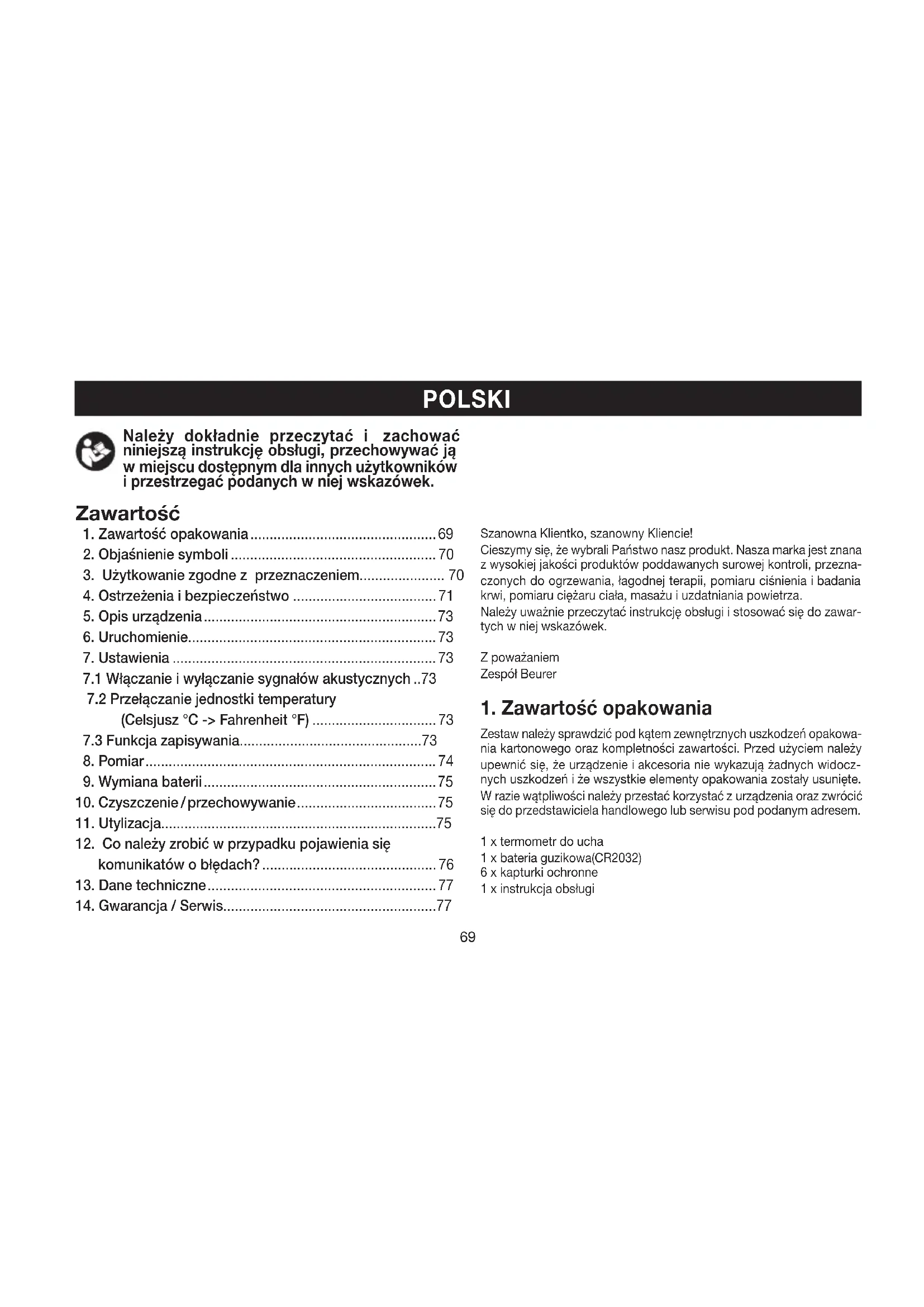 POLSKI Szanowna Klientko, szanowny Kliencie!Cieszymy się, że wybrali Państwo nasz produkt. Nasza marka jest znana zwysokiej jakości produktów poddawanych surowej kontroli, przezna-czonych do ogrzewania, łagodnej terapii, pomiaru ciśnienia ibadania krwi, pomiaru ciężaru ciała, masażu iuzdatniania powietrza.Należy uważnie przeczytać instrukcję obsługi istosować się do zawar-tych wniej wskazówek.Z poważaniemZespół Beurer