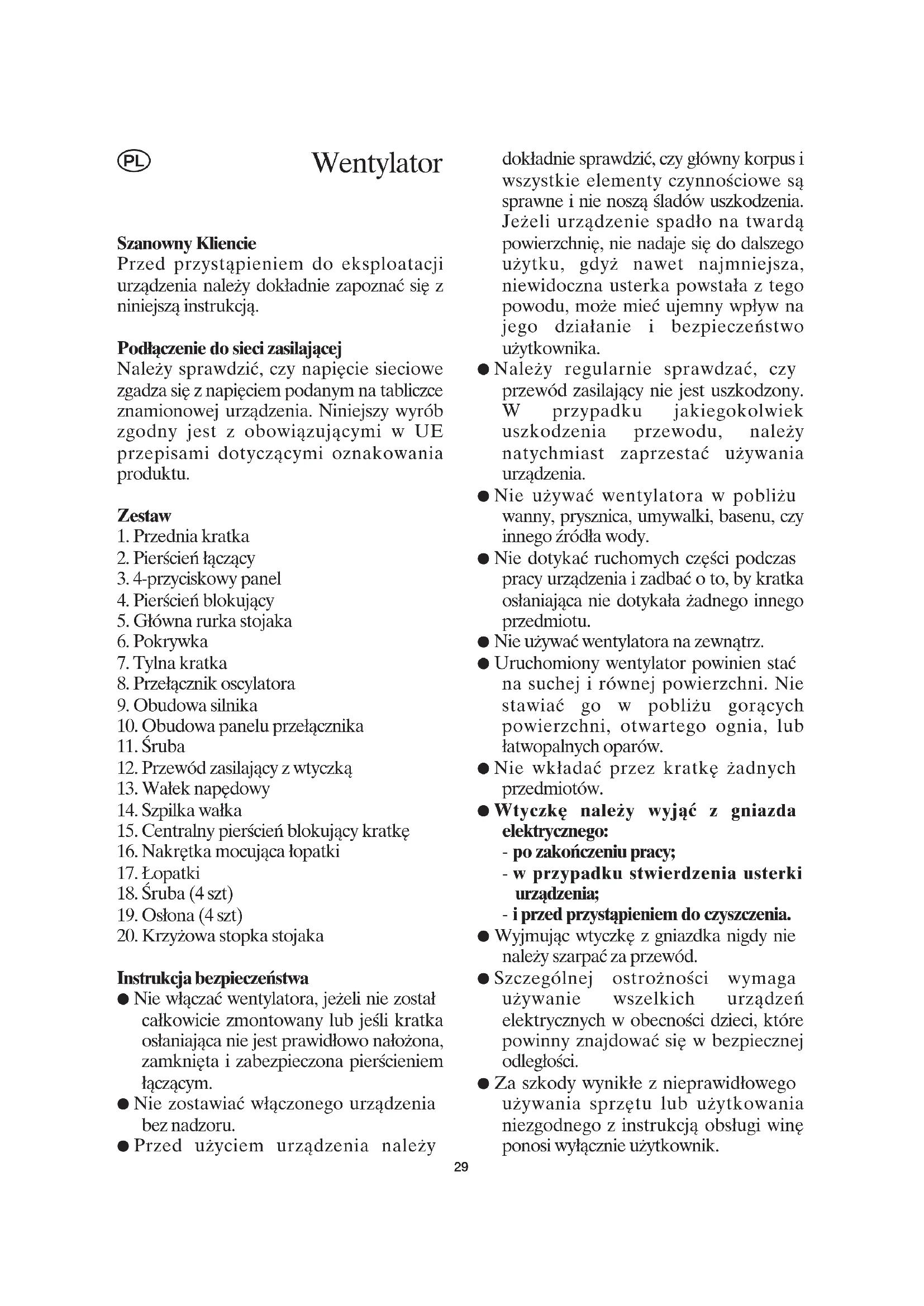 Instrukcja bezpieczeństwa ● Nie włączać wentylatora, jeżeli nie został całkowicie zmontowany lub jeśli kratka osłaniająca nie jest prawidłowo nałożona, zamknięta i zabezpieczona pierścieniem łączącym. ● Nie zostawiać włączonego urządzenia bez nadzoru. ● Przed użyciem urządzenia należy dokładnie sprawdzić, czy główny korpus i wszystkie elementy czynnościowe są sprawne i nie noszą śladów uszkodzenia. Jeżeli urządzenie spadło na twardą powierzchnię, nie nadaje się do dalszego użytku, gdyż nawet najmniejsza, niewidoczna usterka powstała z tego powodu, może mieć ujemny wpływ na jego działanie i bezpieczeństwo użytkownika. ● Należy regularnie sprawdzać, czy przewód zasilający nie jest uszkodzony. W przypadku jakiegokolwiek uszkodzenia przewodu, należy natychmiast zaprzestać używania urządzenia. ● Nie używać wentylatora w pobliżu wanny, prysznica, umywalki, basenu, czy innego źródła wody. ● Nie dotykać ruchomych części podczas pracy urządzenia i zadbać o to, by kratka osłaniająca nie dotykała żadnego innego przedmiotu. ● Nie używać wentylatora na zewnątrz. ● Uruchomiony wentylator powinien stać na suchej i równej powierzchni. Nie stawiać go w pobliżu gorących powierzchni, otwartego ognia, lub łatwopalnych oparów. ● Nie wkładać przez kratkę żadnych przedmiotów. ● Wtyczkę należy wyjąć z gniazda elektrycznego: - po zakończeniu pracy; - w przypadku stwierdzenia usterki urządzenia; - i przed przystąpieniem do czyszczenia. ● Wyjmując wtyczkę z gniazdka nigdy nie należy szarpać za przewód. ● Szczególnej ostrożności wymaga używanie wszelkich urządzeń elektrycznych w obecności dzieci, które powinny znajdować się w bezpiecznej odległości. ● Za szkody wynikłe z nieprawidłowego używania sprzętu lub użytkowania niezgodnego z instrukcją obsługi winę ponosi wyłącznie użytkownik.
