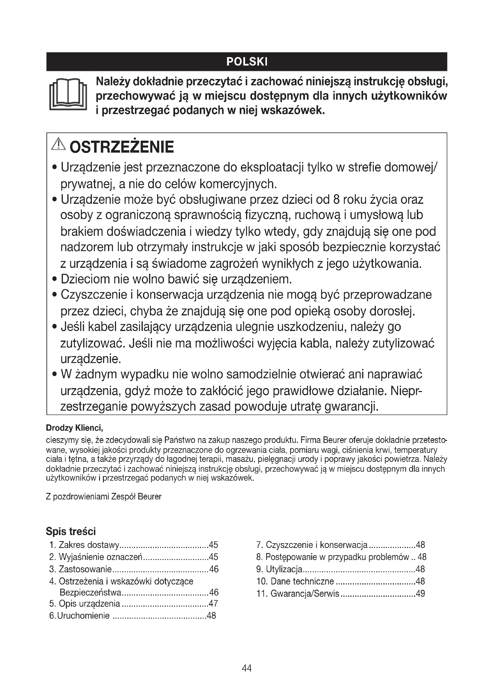 zestrzeganie powyższych zasad powoduje utratę gwarancji. Drodzy Klienci, cieszymy się, że zdecydowali się Państwo na zakup naszego produktu. Firma Beurer oferuje dokładnie przetesto wane, wysokiej jakości produkty przeznaczone do ogrzewania ciała, pomiaru wagi, ciśnienia krwi, temperatury ciała i tętna, a także przyrządy do łagodnej terapii, masażu, pielęgnacji urody i poprawy jakości powietrza. Należy dokładnie przeczytać i zachować niniejszą instrukcję obsługi, przechowywać ją w miejscu dostępnym dla innych użytkowników i przestrzegać podanych w niej wskazówek.Z pozdrowieniami Zespół BeurerSpis treści1. Zakres dostawy ......................................452. Wyjaśnienie oznaczeń ............................45