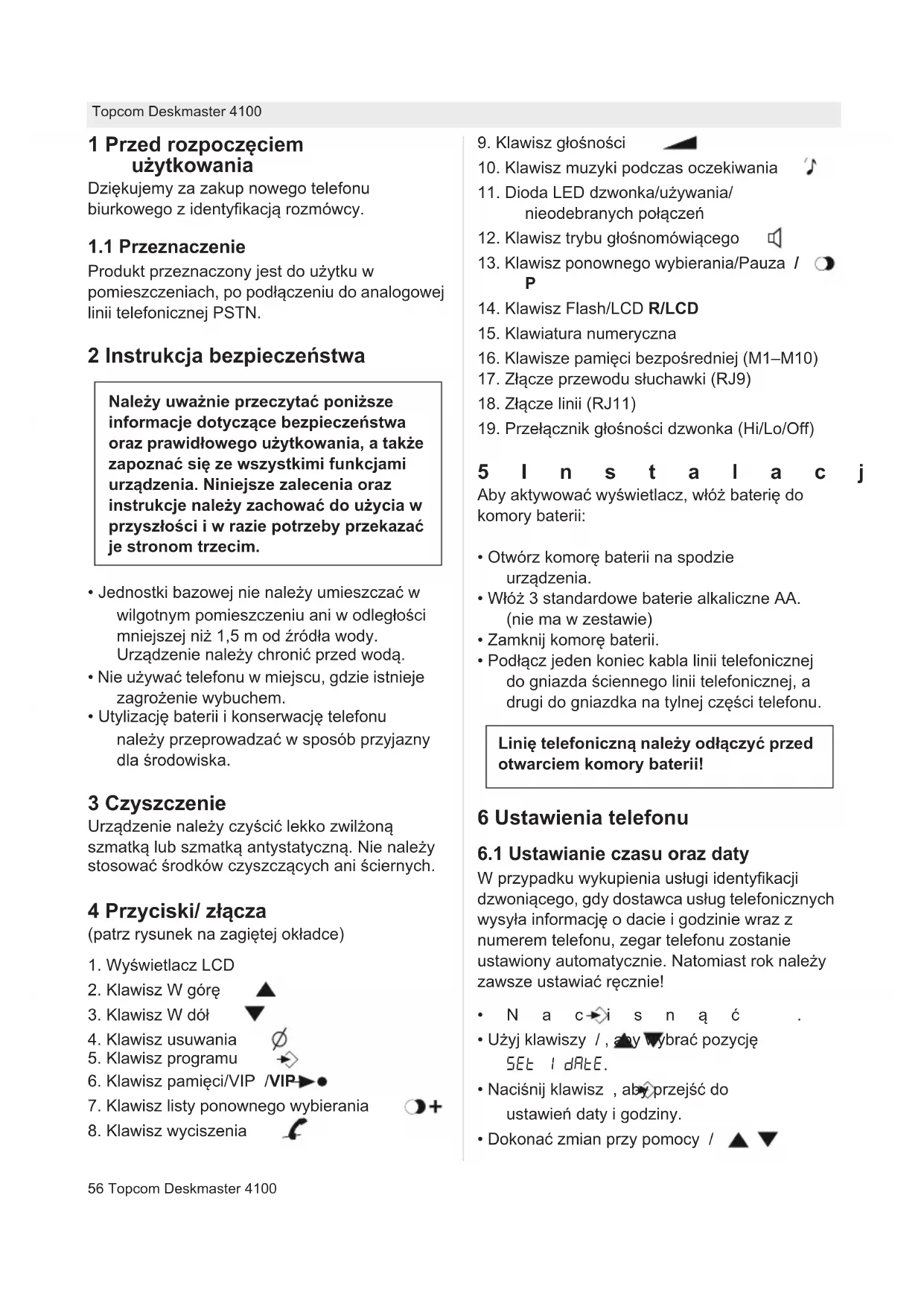 - Dokona zmian przy pomocy / Naley uwanie przeczyta ponisze informacje dotyczce bezpieczestwa oraz prawidowego uytkowania, a take zapozna si ze wszystkimi funkcjami urzdzenia. Niniejsze zalecenia oraz instrukcje naley zachowa do uycia w przyszoci i w razie potrzeby przekaza je stronom trzecim. Lini telefoniczn naley odczy przed otwarciem komory baterii!Topcom Deskmaster 4100 57 Topcom Deskmaster 4100 POLSKI