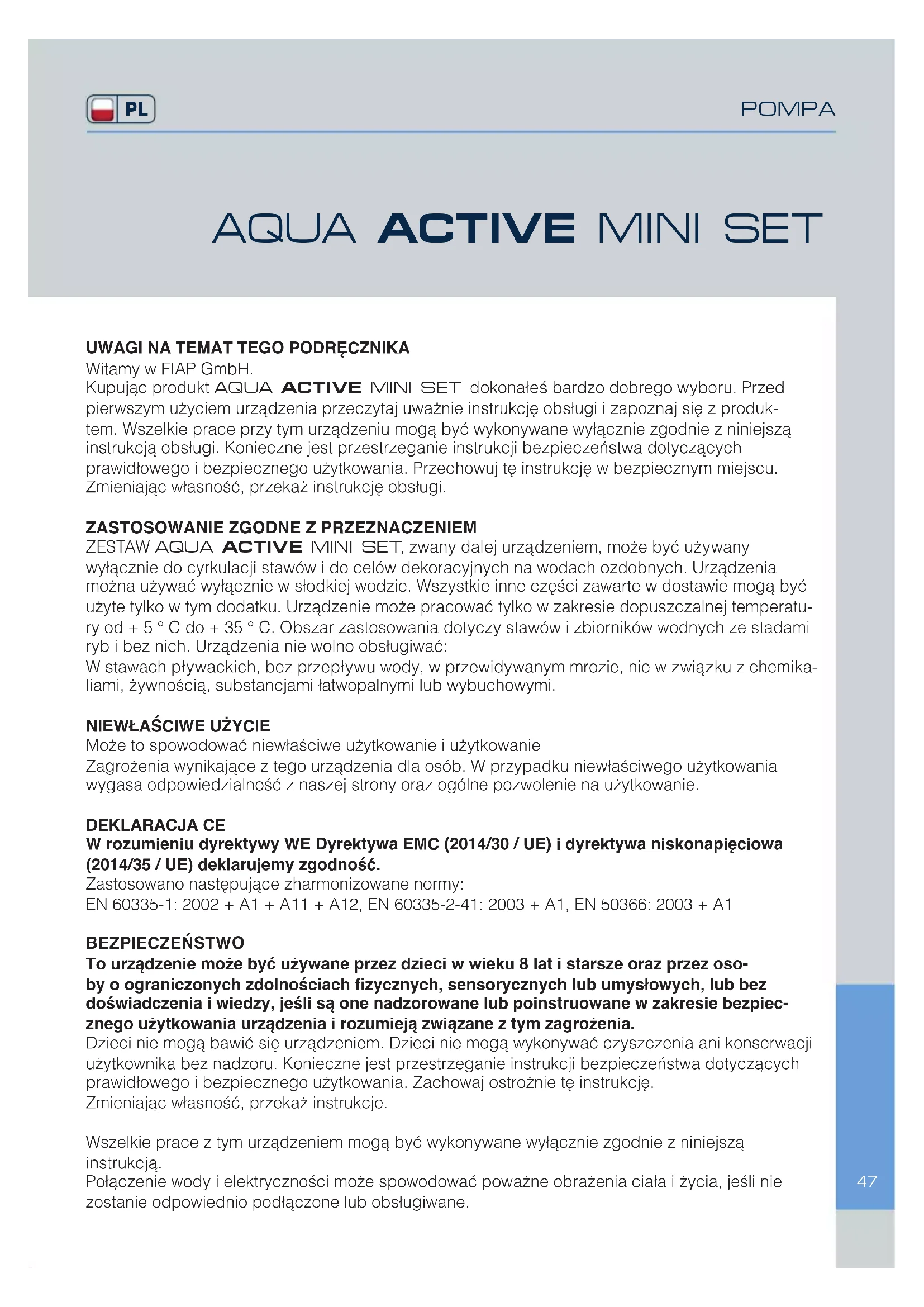 Kupując produkt AQUA ACTIVE MINI SET dokonałeś bardzo dobrego wyboru. Przed pierwszym użyciem urządzenia przeczytaj uważnie instrukcję obsługi i zapoznaj się z produktem. Wszelkie prace przy tym urządzeniu mogą być wykonywane wyłącznie zgodnie z niniejszą instrukcją obsługi. Konieczne jest przestrzeganie instrukcji bezpieczeństwa dotyczących prawidłowego i bezpiecznego użytkowania. Przechowuj tę instrukcję w bezpiecznym miejscu.