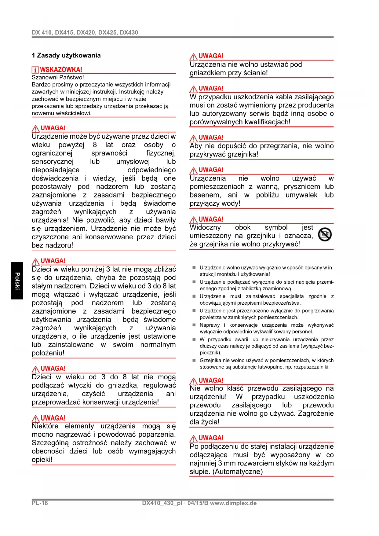 DX 410 1000 575 350 124 4,1 kg DX 415 1500 575 350 124 4,1 kg DX 420 2000 575 350 124 4,1 kg DX425 2500 695 350 124 4,8 kg DX 430 3000 695 350 124 4,8 kg Vrsta Snaga (W) A (mm) DX 410 1000 354 DX 415 1500 354 DX 420 2000 354 DX 425 2500 476 DX 430 3000 476www.dimplex.de DX410_430_hr · 04/15/B HR-17 Hrvatski DX 410, DX415, DX420, DX425, DX430 POZOR! Ovisno o veličini prostorije, potrošnji topline i postavki termostata prostorije se u slučaju nenadziranog grijanja mogu pregrijati. To može uzrokovati opasnosti za osobe koje nisu u stanju napustiti prostoriju u slučaju previsoke temperature. 6 Zaštita od pregrijavanja Grijalica se automatski gasi u slučaju nedopuštenog grijanja. U tom slučaju izvucite mrežni utikač i ostavite uređaj isključen nekoliko minuta kako bi se graničnik temperature resetirao. Zatim uklonite mogući uzrok, npr. blokiranu ili prekri- venu rešetku za zrak. Uređaj možete ponovno staviti u pogon nakon što se dovoljno ohladio. 7Smetnje Ako grijalica ne grije, provjerite je li uređaj uključen i je li termostat postavljen na željenu temperaturu, zatim je li automat u raspodjeli struje uključen odnosno je li osi- gurač ispravan. Ako ne možete ukloniti smetnju, obratite se najbližoj servisnoj službi. Za obradu naloga bit će potrebni E i FD broj uređaja. Ove specifikacije pronaći ćete na označnoj pločici. Popravke i zahvate na uređaju smije obavljati samo kvalificirani električar ili servisna služba. Glen Dimplex Deutschland GmbH Am Goldenen Feld 18 D-95326 Kulmbach Pridržano pravo na tehničke izmjene 8 Servisna služba U slučaju potrebe za servisnom službom potrebno je obavijestiti Robert Bosch Hausgeräte GmbH kao nad- ležnu servisnu službu. Kontaktne podatke pronaći čete na 2. stranici pod „Jamstvo, servisna služba, adresa“. 9 Čišćenje Uređaj je za čišćenje potrebno isključiti iz mreže i ohla- diti. Vanjska strana može se čistiti brisanjem mekanom i vlažnom krpom. Nemojte se prilikom čišćenja koristiti abrazivnim praškom ili politurama za pokućstvo jer mogu oštetiti površinu. Nakupine prašine u uređaju mogu se usisati izvana s pomoću usisivača. 10 Jamstvo Za ovaj proizvod dajemo 2 godine jamstva u skladu s našim uvjetima jamstva. 11 Napomena za zbrinjavanje Uređaj nemojte zbrinjavati u uobičajeni kućni otpad nego ga odnesite na lokalno odlagali- šte. Telefon: +49 9221 709-564 Faks: +49 9221 709-589 E-pošta: 09221709589@dimplex.de www.dimplex.dePL-18 DX410_430_pl · 04/15/B www.dimplex.de Polski DX 410, DX415, DX420, DX425, DX430 1 Zasady użytkowania WSKAZÓWKA! Szanowni Państwo! Bardzo prosimy o przeczytanie wszystkich informacji zawartych w niniejszej instrukcji. Instrukcję należy zachować w bezpiecznym miejscu i w razie przekazania lub sprzedaży urządzenia przekazać ją nowemu właścicielowi. UWAGA! Urządzenie może być używane przez dzieci w wieku powyżej 8 lat oraz osoby o ograniczonej sprawności fizycznej, sensorycznej lub umysłowej lub nieposiadające odpowiedniego doświadczenia i wiedzy, jeśli będą one pozostawały pod nadzorem lub zostaną zaznajomione z zasadami bezpiecznego używania urządzenia i będą świadome zagrożeń wynikających z używania urządzenia! Nie pozwolić, aby dzieci bawiły się urządzeniem. Urządzenie nie może być czyszczone ani konserwowane przez dzieci bez nadzoru! UWAGA! Dzieci w wieku poniżej 3 lat nie mogą zbliżać się do urządzenia, chyba że pozostają pod stałym nadzorem. Dzieci w wieku od 3 do 8 lat mogą włączać i wyłączać urządzenie, jeśli pozostają pod nadzorem lub zostaną zaznajomione z zasadami bezpiecznego użytkowania urządzenia i będą świadome zagrożeń wynikających z używania urządzenia, o ile urządzenie jest ustawione lub zainstalowane w swoim normalnym położeniu! UWAGA! Dzieci w wieku od 3 do 8 lat nie mogą podłączać wtyczki do gniazdka, regulować urządzenia, czyścić urządzenia ani przeprowadzać konserwacji urządzenia! UWAGA! Niektóre elementy urządzenia mogą się mocno nagrzewać i powodować poparzenia. Szczególną ostrożność należy zachować w obecności dzieci lub osób wymagających opieki! UWAGA! Urządzenia nie wolno ustawiać pod gniazdkiem przy ścianie! UWAGA! W przypadku uszkodzenia kabla zasilającego musi on zostać wymieniony przez producenta lub autoryzowany serwis bądź inną osobę o porównywalnych kwalifikacjach! UWAGA! Aby nie dopuścić do przegrzania, nie wolno przykrywać grzejnika! UWAGA! Urządzenia nie wolno używać w pomieszczeniach z wanną, prysznicem lub basenem, ani w pobliżu umywalek lub przyłączy wody! UWAGA! Widoczny obok symbol jest umieszczony na grzejniku i oznacza, że grzejnika nie wolno przykrywać! Urządzenie wolno używać wyłącznie w sposób opisany w in- strukcji montażu i użytkowania! Urządzenie podłączać wyłącznie do sieci napięcia przemi- ennego zgodnej z tabliczką znamionową. Urządzenie musi zainstalować specjalista zgodnie z obowiązującymi przepisami bezpieczeństwa. Urządzenie jest przeznaczone wyłącznie do podgrzewania powietrza w zamkniętych pomieszczeniach. Naprawy i konserwacje urządzenia może wykonywać wyłącznie odpowiednio wykwalifikowany personel. W przypadku awarii lub nieużywania urządzenia przez dłuższy czas należy je odłączyć od zasilania (wyłączyć bez- piecznik). Grzejnika nie wolno używać w pomieszczeniach, w których stosowane są substancje łatwopalne, np. rozpuszczalniki. UWAGA! Nie wolno kłaść przewodu zasilającego na urządzeniu! W przypadku uszkodzenia przewodu zasilającego lub przewodu urządzenia nie wolno go używać. Zagrożenie dla życia! UWAGA! Po podłączeniu do stałej instalacji urządzenie odłączające musi być wyposażony w co najmniej 3 mm rozwarciem styków na każdym słupie. (Automatyczne)www.dimplex.de DX410_430_pl · 04/15/B PL-19 Polski DX 410, DX415, DX420, DX425, DX430 UWAGA! Aby uniknąć zagrożenia na skutek przypadkowego zresetowa