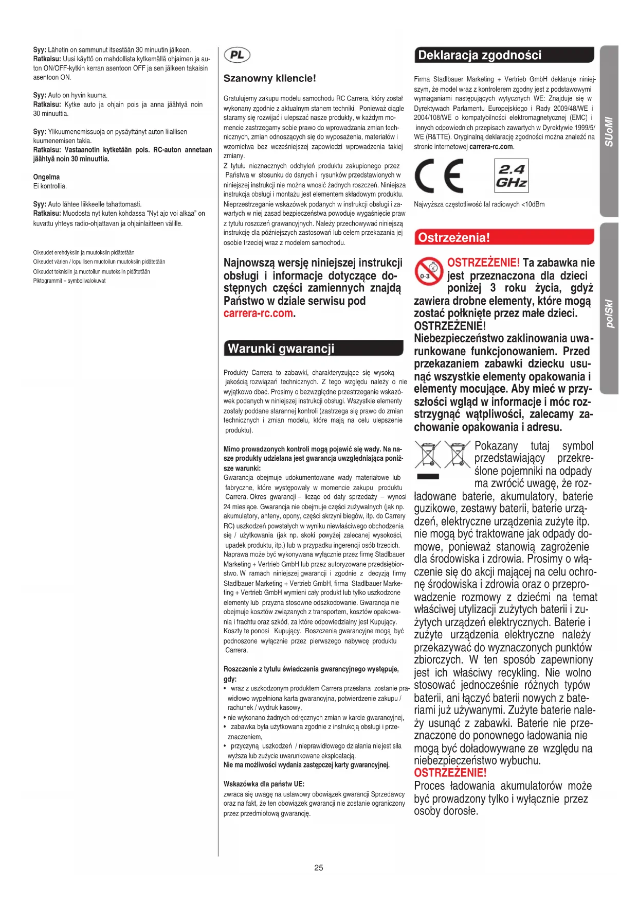 2,4 GHz teknologian ansiosta ajoradalla voi ajaa samanai- kaisesti 16 ajoneuvoa. Se on mahdollista ilman tajuuden sovitusta ajajien kesken. Ongelmaratkaisut Ongelma Auto ei kulje. Syy: Lähettimen ja/tai auton kytkin on kohdassa „OFF“. Ratkaisu: Kytketään päälle. Syy: Autossa heikko akku tai ei ollenkaan akkua. Ratkaisu: Ladattu akku laitetaan sisään. Syy: Auto on jäänyt seisomaan esteeseen. Ratkaisu: Ylikuormitussuoja on kytkenyt auton pois. Käännä auton ON/OFF-kytkin asentoon OFF, takaisin asentoon ON ja vie auto vapaaseen paikkaan. Syy: Lähettimessä tai autossa heikko akku/paristo. Ratkaisu: Ladattu akku tai paristo laitetaan sisään. Syy: Ohjainlaitetta ei ehkä ole yhdistetty oikein radio-ohjattavan vastaanottimeen. Ratkaisu: Muodosta nyt kuten kohdassa “Nyt ajo voi alkaa” on kuvattu yhteys radio-ohjattavan ja ohjainlaitteen välille. SUoMI25 Syy: Lähetin on sammunut itsestään 30 minuutin jälkeen. Ratkaisu: Uusi käyttö on mahdollista kytkemällä ohjaimen ja au- ton ON/OFF-kytkin kerran asentoon OFF ja sen jälkeen takaisin asentoon ON. Syy: Auto on hyvin kuuma. Ratkaisu: Kytke auto ja ohjain pois ja anna jäähtyä noin 30 minuuttia. Syy: Ylikuumenemissuoja on pysäyttänyt auton liiallisen kuumenemisen takia. Ratkaisu: Vastaanotin kytketään pois. RC-auton annetaan jäähtyä noin 30 minuuttia. Ongelma Ei kontrollia. Syy: Auto lähtee liikkeelle tahattomasti. Ratkaisu: Muodosta nyt kuten kohdassa “Nyt ajo voi alkaa” on kuvattu yhteys radio-ohjattavan ja ohjainlaitteen välille. Oikeudet erehdyksiin ja muutoksiin pidätetään Oikeudet värien / lopullisen muotoilun muutoksiin pidätetään Oikeudet teknisiin ja muotoilun muutoksiin pidätetään Piktogrammit = symbolivalokuvat Szanowny kliencie! Gratulujemy zakupu modelu samochodu RC Carrera, który został wykonany zgodnie z aktualnym stanem techniki. Ponieważ ciągle staramy się rozwijać i ulepszać nasze produkty, w każdym mo- mencie zastrzegamy sobie prawo do wprowadzania zmian tech- nicznych, zmian odnoszących się do wyposażenia, materiałów i wzornictwa bez wcześniejszej zapowiedzi wprowadzenia takiej zmiany. Z tytułu nieznacznych odchyleń produktu zakupionego przez Państwa w stosunku do danych i rysunków przedstawionych w niniejszej instrukcji nie można wnosić żadnych roszczeń. Niniejsza instrukcja obsługi i montażu jest elementem składowym produktu. Nieprzestrzeganie wskazówek podanych w instrukcji obsługi i za- wartych w niej zasad bezpieczeństwa powoduje wygaśnięcie praw z tytułu roszczeń grawancyjnych. Należy przechowywać niniejszą instrukcję dla późniejszych zastosowań lub celem przekazania jej osobie trzeciej wraz z modelem samochodu. Najnowszą wersję niniejszej instrukcji obsługi i informacje dotyczące do- stępnych części zamiennych znajdą Państwo w dziale serwisu pod carrera-rc.com. Warunki gwarancji Produkty Carrera to zabawki, charakteryzujące się wysoką jakością rozwiązań technicznych. Z tego względu należy o nie wyjątkowo dbać. Prosimy o bezwzględne przestrzeganie wskazó- wek podanych w niniejszej instrukcji obsługi. Wszystkie elementy zostały poddane starannej kontroli (zastrzega się prawo do zmian technicznych i zmian modelu, które mają na celu ulepszenie produktu). Mimo prowadzonych kontroli mogą pojawić się wady. Na na- sze produkty udzielana jest gwarancja uwzględniająca poniż- sze warunki: Gwarancja obejmuje udokumentowane wady materiałowe lub fabryczne, które występowały w momencie zakupu produktu Carrera. Okres gwarancji – licząc od daty sprzedaży – wynosi 24 miesiące. Gwarancja nie obejmuje części zużywalnych (jak np. akumulatory, anteny, opony, części skrzyni biegów, itp. do Carrery RC) uszkodzeń powstałych w wyniku niewłaściwego obchodzenia się / użytkowania (jak np. skoki powyżej zalecanej wysokości, upadek produktu, itp.) lub w przypadku ingerencji osób trzecich. Naprawa może być wykonywana wyłącznie przez firmę Stadlbauer Marketing + Vertrieb GmbH lub przez autoryzowane przedsiębior- stwo. W ramach niniejszej gwarancji i zgodnie z decyzją firmy Stadlbauer Marketing + Vertrieb GmbH, firma Stadlbauer Marke- ting + Vertrieb GmbH wymieni cały produkt lub tylko uszkodzone elementy lub przyzna stosowne odszkodowanie. Gwarancja nie obejmuje kosztów związanych z transportem, kosztów opakowa- nia i frachtu oraz szkód, za które odpowiedzialny jest Kupujący. Koszty te ponosi Kupujący. Roszczenia gwarancyjne mogą być podnoszone wyłącznie przez pierwszego nabywcę produktu Carrera. Roszczenie z tytułu świadczenia gwarancyjnego występuje, gdy: