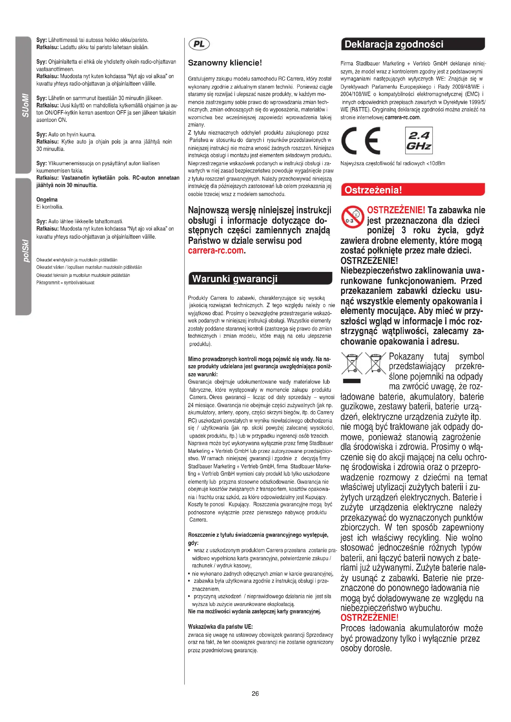 Karbiinilukkoinen kaulanauha kiinnitetään kauko-ohjaimen silmukkaan ja ripustetaan kaulaan. VAROITUS! Kuristumisvaara! Ongelmaratkaisut Ongelma Auto ei kulje. Syy: Lähettimen ja/tai auton kytkin on kohdassa „OFF“. Ratkaisu: Kytketään päälle. Syy: Autossa heikko akku tai ei ollenkaan akkua. Ratkaisu: Ladattu akku laitetaan sisään. Syy: Auto on jäänyt seisomaan esteeseen. Ratkaisu: Ylikuormitussuoja on kytkenyt auton pois. Käännä auton ON/OFF-kytkin asentoon OFF, takaisin asentoon ON ja vie auto vapaaseen paikkaan. SUoMI26 Syy: Lähettimessä tai autossa heikko akku/paristo. Ratkaisu: Ladattu akku tai paristo laitetaan sisään. Syy: Ohjainlaitetta ei ehkä ole yhdistetty oikein radio-ohjattavan vastaanottimeen. Ratkaisu: Muodosta nyt kuten kohdassa “Nyt ajo voi alkaa” on kuvattu yhteys radio-ohjattavan ja ohjainlaitteen välille. Syy: Lähetin on sammunut itsestään 30 minuutin jälkeen. Ratkaisu: Uusi käyttö on mahdollista kytkemällä ohjaimen ja au- ton ON/OFF-kytkin kerran asentoon OFF ja sen jälkeen takaisin asentoon ON. Syy: Auto on hyvin kuuma. Ratkaisu: Kytke auto ja ohjain pois ja anna jäähtyä noin 30 minuuttia. Syy: Ylikuumenemissuoja on pysäyttänyt auton liiallisen kuumenemisen takia. Ratkaisu: Vastaanotin kytketään pois. RC-auton annetaan jäähtyä noin 30 minuuttia. Ongelma Ei kontrollia. Syy: Auto lähtee liikkeelle tahattomasti. Ratkaisu: Muodosta nyt kuten kohdassa “Nyt ajo voi alkaa” on kuvattu yhteys radio-ohjattavan ja ohjainlaitteen välille. Oikeudet erehdyksiin ja muutoksiin pidätetään Oikeudet värien / lopullisen muotoilun muutoksiin pidätetään Oikeudet teknisiin ja muotoilun muutoksiin pidätetään Piktogrammit = symbolivalokuvat Szanowny kliencie! Gratulujemy zakupu modelu samochodu RC Carrera, który został wykonany zgodnie z aktualnym stanem techniki. Ponieważ ciągle staramy się rozwijać i ulepszać nasze produkty, w każdym mo- mencie zastrzegamy sobie prawo do wprowadzania zmian tech- nicznych, zmian odnoszących się do wyposażenia, materiałów i wzornictwa bez wcześniejszej zapowiedzi wprowadzenia takiej zmiany. Z tytułu nieznacznych odchyleń produktu zakupionego przez Państwa w stosunku do danych i rysunków przedstawionych w niniejszej instrukcji nie można wnosić żadnych roszczeń. Niniejsza instrukcja obsługi i montażu jest elementem składowym produktu. Nieprzestrzeganie wskazówek podanych w instrukcji obsługi i za- wartych w niej zasad bezpieczeństwa powoduje wygaśnięcie praw z tytułu roszczeń grawancyjnych. Należy przechowywać niniejszą instrukcję dla późniejszych zastosowań lub celem przekazania jej osobie trzeciej wraz z modelem samochodu. Najnowszą wersję niniejszej instrukcji obsługi i informacje dotyczące do- stępnych części zamiennych znajdą Państwo w dziale serwisu pod carrera-rc.com. Warunki gwarancji Produkty Carrera to zabawki, charakteryzujące się wysoką jakością rozwiązań technicznych. Z tego względu należy o nie wyjątkowo dbać. Prosimy o bezwzględne przestrzeganie wskazó- wek podanych w niniejszej instrukcji obsługi. Wszystkie elementy zostały poddane starannej kontroli (zastrzega się prawo do zmian technicznych i zmian modelu, które mają na celu ulepszenie produktu). Mimo prowadzonych kontroli mogą pojawić się wady. Na na- sze produkty udzielana jest gwarancja uwzględniająca poniż- sze warunki: Gwarancja obejmuje udokumentowane wady materiałowe lub fabryczne, które występowały w momencie zakupu produktu Carrera. Okres gwarancji – licząc od daty sprzedaży – wynosi 24 miesiące. Gwarancja nie obejmuje części zużywalnych (jak np. akumulatory, anteny, opony, części skrzyni biegów, itp. do Carrery RC) uszkodzeń powstałych w wyniku niewłaściwego obchodzenia się / użytkowania (jak np. skoki powyżej zalecanej wysokości, upadek produktu, itp.) lub w przypadku ingerencji osób trzecich. Naprawa może być wykonywana wyłącznie przez firmę Stadlbauer Marketing + Vertrieb GmbH lub przez autoryzowane przedsiębior- stwo. W ramach niniejszej gwarancji i zgodnie z decyzją firmy Stadlbauer Marketing + Vertrieb GmbH, firma Stadlbauer Marke- ting + Vertrieb GmbH wymieni cały produkt lub tylko uszkodzone elementy lub przyzna stosowne odszkodowanie. Gwarancja nie obejmuje kosztów związanych z transportem, kosztów opakowa- nia i frachtu oraz szkód, za które odpowiedzialny jest Kupujący. Koszty te ponosi Kupujący. Roszczenia gwarancyjne mogą być podnoszone wyłącznie przez pierwszego nabywcę produktu Carrera. Roszczenie z tytułu świadczenia gwarancyjnego występuje, gdy: