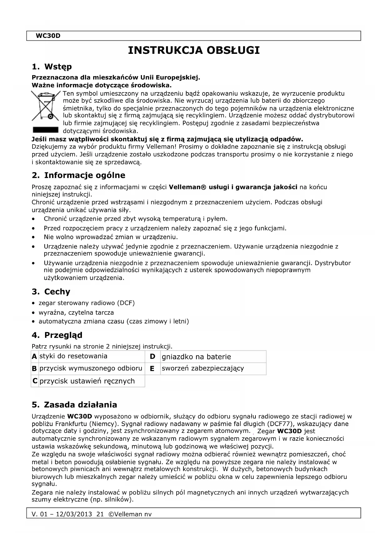 WC30D - Zegarek VELLEMAN - Bezpłatna instrukcja obsługi