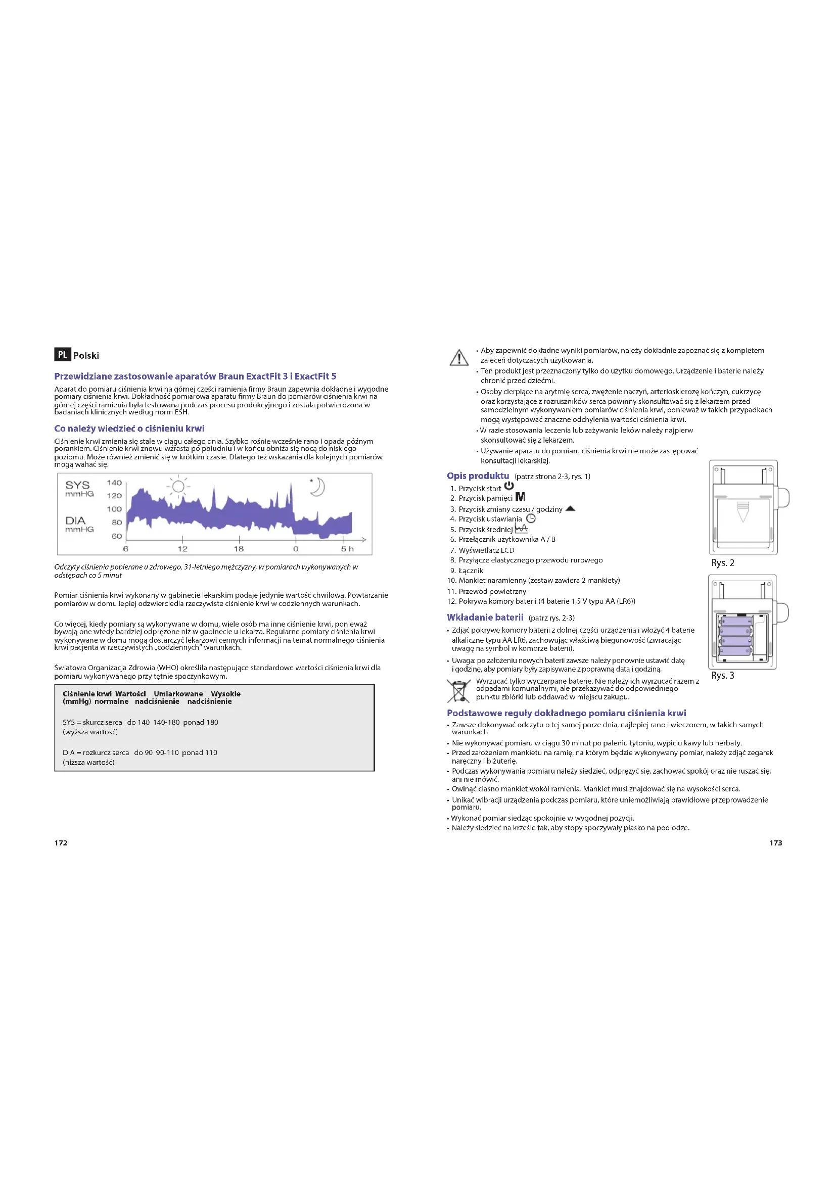 Polski Przewidziane zastosowanie aparatów Braun ExactFit 3 i ExactFit 5 Aparat do pomiaru ciśnienia krwi na górnej części ramienia rmy Braun zapewnia dokładne i wygodne pomiary ciśnienia krwi. Dokładność pomiarowa aparatu rmy Braun do pomiarów ciśnienia krwi na górnej części ramienia była testowana podczas procesu produkcyjnego i została potwierdzona w badaniach klinicznych według norm ESH. Co należy wiedzieć o ciśnieniu krwi Ciśnienie krwi zmienia się stale w ciągu całego dnia. Szybko rośnie wcześnie rano i opada późnym porankiem. Ciśnienie krwi znowu wzrasta po południu i w końcu obniża się nocą do niskiego poziomu. Może również zmienić się w krótkim czasie. Dlatego też wskazania dla kolejnych pomiarów mogą wahać się. Odczyty ciśnienia pobierane u zdrowego, 31-letniego mężczyzny, w pomiarach wykonywanych w odstępach co 5 minut Pomiar ciśnienia krwi wykonany w gabinecie lekarskim podaje jedynie wartość chwilową. Powtarzanie pomiarów w domu lepiej odzwierciedla rzeczywiste ciśnienie krwi w codziennych warunkach. Co więcej, kiedy pomiary są wykonywane w domu, wiele osób ma inne ciśnienie krwi, ponieważ bywają one wtedy bardziej odprężone niż w gabinecie u lekarza. Regularne pomiary ciśnienia krwi wykonywane w domu mogą dostarczyć lekarzowi cennych informacji na temat normalnego ciśnienia krwi pacjenta w rzeczywistych „codziennych” warunkach. Światowa Organizacja Zdrowia (WHO) określiła następujące standardowe wartości ciśnienia krwi dla pomiaru wykonywanego przy tętnie spoczynkowym. Ciśnienie krwi Wartości Umiarkowane Wysokie (mmHg) normalne nadciśnienie nadciśnienie SYS = skurcz serca do 140 140-180 ponad 180 (wyższa wartość) DIA = rozkurcz serca do 90 90-110 ponad 110 (niższa wartość)