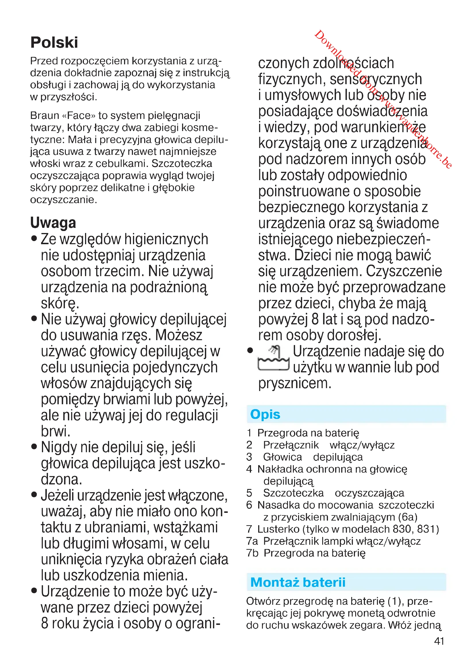 Urządzenie nadaje się do użytku w wannie lub pod prysznicem. Opis 1 Przegroda na baterię 2 Przełącznik włącz/wyłącz 3 Głowica depilująca 4 Nakładka ochronna na głowicę depilującą 5 Szczoteczka oczyszczająca 6 Nasadka do mocowania szczoteczki z przyciskiem zwalniającym (6a) 7 Lusterko (tylko w modelach 830, 831) 7a Przełącznik lampki włącz/wyłącz 7b Przegroda na baterię Montaż baterii Otwórz przegrodę na baterię (1), prze- kręcając jej pokrywę monetą odwrotnie do ruchu wskazówek zegara. Włóż jedną 96892473_SE810_S4-110.indd 4196892473_SE810_S4-110.indd 41 27.02.14 15:3327.02.14 15:33 CSS APPROVED Effective Date 5Mar2014 GMT - Printed 02Oct2014 Page 41 of 110 Downloaded from www.vandenborre.be42 baterię alkaliczną AA (1,5 V), zwracając uwagę na odpowiednie dopasowanie biegunów. Dopasuj pokrywę do przegrody i zamknij ją przekręcając zgodnie z ruchem wskazówek zegara. W razie potrzeby wymień baterię. Upewnij się, że podczas usuwania baterii twoje dłonie i urządzenie są suche. Lusterko: Za pomocą śrubokręta otwórz przegrodę na baterię (7b) w sposób, który pokazano na obrazku. Włóż trzy baterie pastylkowe (typu LR1130) biegu- nem + do góry. Zamknij przegrodę na baterię. Bateria może przeciekać, jeśli jest pusta lub nie jest używana przez długi czas. Aby chronić siebie i urządzenie, wymieniaj baterię regularnie i unikaj kontaktu ze skórą w przypadku przeciekających baterii. Depilacja twarzy