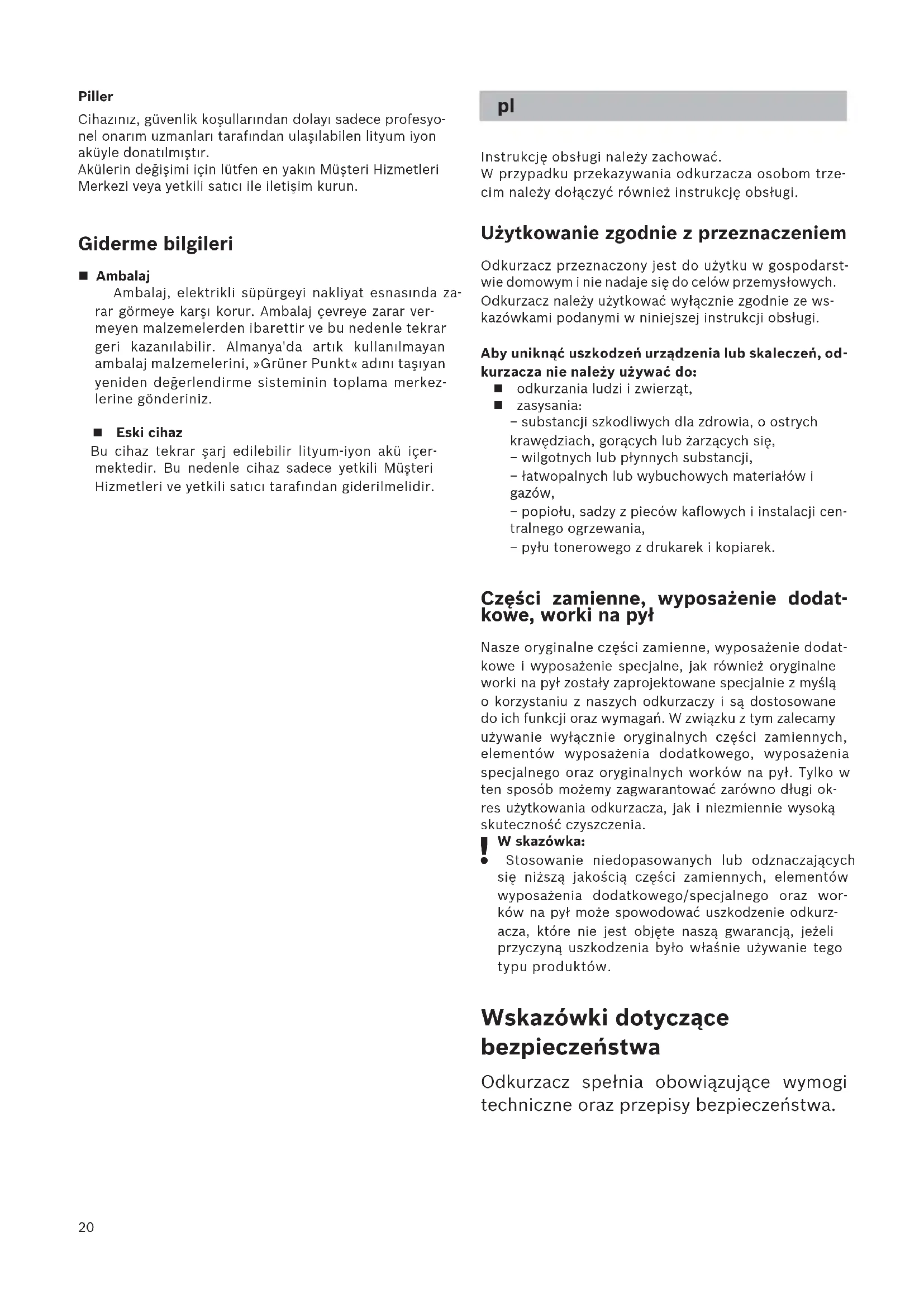 Wskazówka: Stosowanie niedopasowanych lub odznaczających się niższą jakością części zamiennych, elementów wyposażenia dodatkowego/specjalnego oraz wor- ków na pył może spowodować uszkodzenie odkurz- acza, które nie jest objęte naszą gwarancją, jeżeli przyczyną uszkodzenia było właśnie używanie tego typu produktów. Wskazówki dotyczące bezpieczeństwa Odkurzacz spełnia obowiązujące wymogi techniczne oraz przepisy bezpieczeństwa.21 Urządzenie mogą obsługiwać dzieci w wieku powyżej 8 lat oraz osoby z ogra- niczonymi zdolnościami fizycznymi, sen- sorycznymi lub umysłowymi, a także osoby nie posiadające wystarczającego doświadczenia i/lub wiedzy, jeśli pozostają pod nadzorem lub zostały pouczone, jak bezpiecznie obsługiwać urządzenie i są świadome związanego z tym niebezpieczeństwa. Dzieci nie mogą bawić się urządzeniem. Dzieciom bez nadzoru nie wolno przeprowadzać czyszczenia ani konser- wacji. Plastikowe torby i folie przechowywać poza zasięgiem dzieci i usunąć w bezpi- eczny sposób. >= Istnieje niebezpieczeństwo uduszenia! Prawidłowe użytkowanie Podczas ładowania należy używać tylko przewodu do ładowania wchodzącego w zakres wyposażenia. Przewód ładowarki należy podłączać i uruchamiać wyłącznie zgodnie z informacjami zawartymi na tab- liczce znamionowej. Urządzenie należy przechowywać i ładować wyłącznie w pomieszczeniach. Nie narażać urządzenia na działanie temperatur poniżej 0°C oraz powyżej 40°C. Nigdy nie odkurzać bez worka filtrującego lub pojem- nika na pył, filtra zabezpieczającego silnik i filtra wy- lotu powietrza. >= Urządzenie może ulec uszkodzeniu! Nie odkurzać w okolicach głowy przy użyciu szczotki ani rury. => Istnieje niebezpieczeństwo obrażeń! Nie używać uszkodzonego przewodu ładowarki i wymienić go na nowy, oryginalny przewód. W celu odłączenia przewodu ładowarki od sieci ciągnąć za wtyczkę, a nie za przewód zasilający. Przewodu ładowarki nie wolno prowadzić po ostrych krawędziach ani zaciskać. Przed przystąpieniem do jakichkolwiek prac przy odkurzaczu należy wyłączyć urządzenie lub odłączyć przewód ładowarki od sieci. Nie włączać uszkodzonego odkurzacza. W przypadku stwierdzenia usterki wyłączyć urządzenie lub odłączyć przewód ładowarki od sieci. W celu uniknięcia zagrożeń, naprawy urządzenia oraz wymiana części w odkurzaczu mogą być wykonywane wyłącznie przez autoryzowany serwis. W następujących przypadkach należy natychmiast odłączyć urządzenie od sieci zasilającej i skontaktować się z serwisem: − jeśli przypadkowo został zassany płyn lub jeśli płyn przedostał się do wnętrza urządzenia. − jeśli urządzenie spadło i zostało uszkodzone. Odkurzacz należy chronić przed wpływem czynników atmosferycznych, wilgocią i źródłami ciepła. Unikać kontaktu filtrów (worek filtrujący, filtr zabezpieczający silnik, filtr wylotu powietrza itp.) z materiałami łatwopalnymi oraz zawierającymi alkohol. Odkurzacz nie nadaje się do stosowania na placach budowy. =>Odsysanie gruzu budowlanego może prowadzić do uszkodzenia urządzenia. Gdy odkurzacz nie jest używany, należy go wyłączać. Opakowanie chroni odkurzacz przed uszkodzeniem podczas transportu. Dlatego zaleca się zachowanie oryginalnego opakowania do celów transportowych. Baterie Urządzenie jest wyposażone w akumulatory litowo- jonowe, które ze względów bezpieczeństwa są dostępne wyłącznie dla pracowników profesjonalnego serwisu naprawczego. W celu wymiany akumulatorów należy zwrócić się do najbliższego serwisu lub autoryzowanego przedstawicie- la handlowego. Wskazówki dotyczące utylizacji Opakowanie Opakowanie chroni odkurzacz przed uszkodzeniem podczas transportu. Składa się ono z materiałów bezpiecznych dla środowiska naturalnego i nadaje się do odzysku surowców wtórnych. Niepotrzebne materiały opakowaniowe należy oddać do punktów zbiórki surowców wtórnych. Wysłużone urządzenie Urządzenie zawiera akumulatory litowo-jonowe, które można ponownie naładować. Dlatego utyli- zacji urządzenia można dokonać wyłącznie poprzez autoryzowany serwis lub specjalistyczny punkt sprzedaży.22