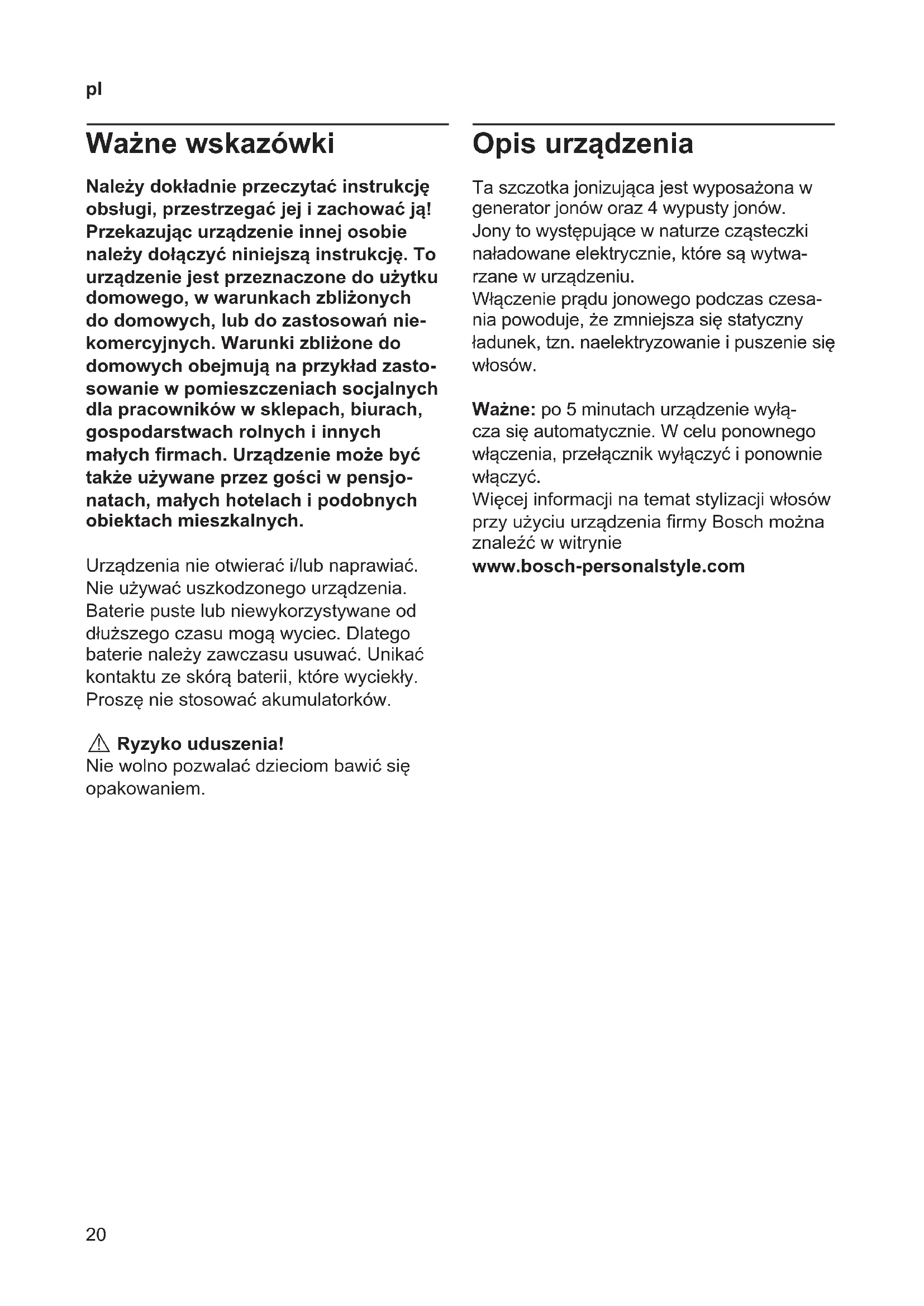 Ryzyko uduszenia! Nie wolno pozwalać dzieciom bawić się opakowaniem. Opis urządzenia Ta szczotka jonizująca jest wyposażona w generator jonów oraz 4 wypusty jonów. Jony to występujące w naturze cząsteczki naładowane elektrycznie, które są wytwa- rzane w urządzeniu. Włączenie prądu jonowego podczas czesa- nia powoduje, że zmniejsza się statyczny ładunek, tzn. naelektryzowanie i puszenie się włosów. Ważne: po 5 minutach urządzenie wyłą- cza się automatycznie. W celu ponownego włączenia, przełącznik wyłączyć i ponownie włączyć. Więcej informacji na temat stylizacji włosów przy użyciu urządzenia rmy Bosch można znaleźć w witrynie www.bosch-personalstyle.com21