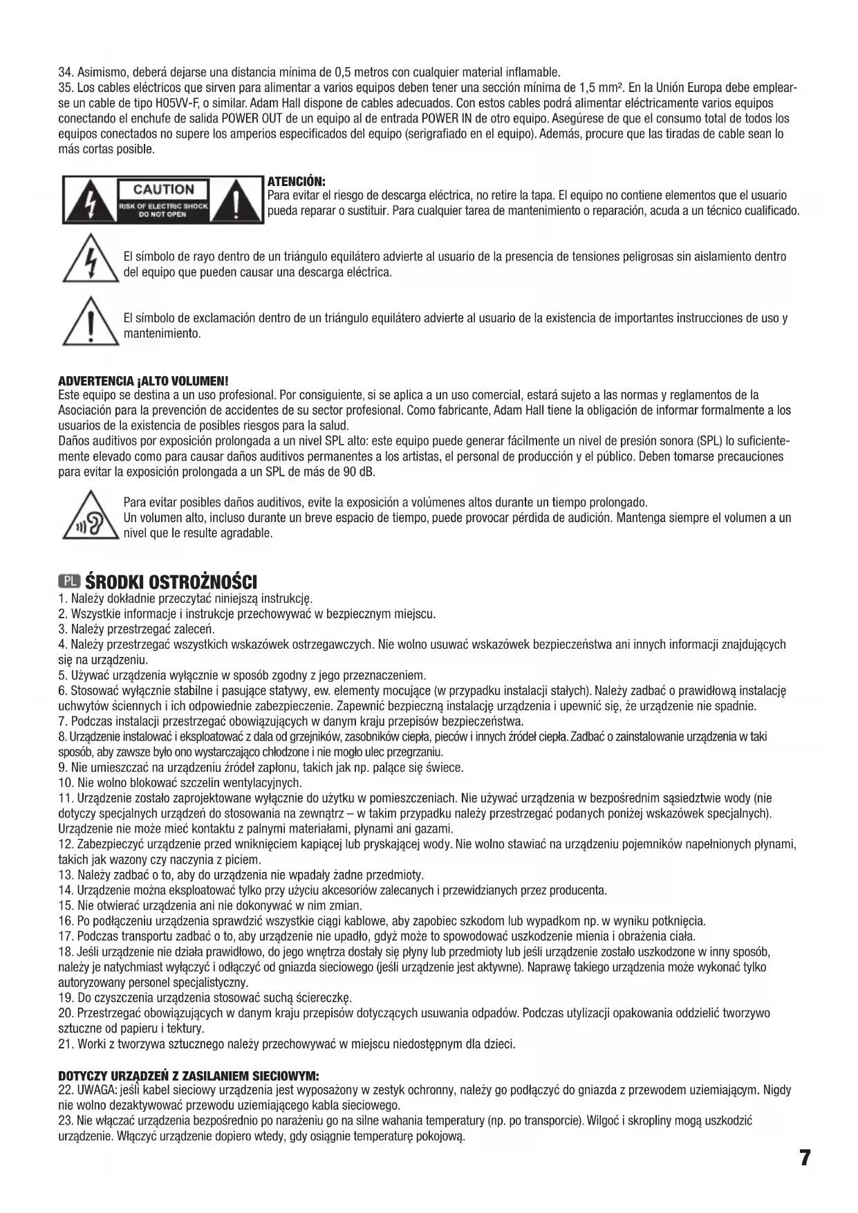 35. Powierzchnia przekroju poprzecznego przewodów zasilających większą liczbę urządzeń musi wynosić co najmniej 1,5 mm². W krajach Unii Europejskiej przewody muszą spełniać wymagania normy H05VV-F lub podobne wytyczne. Adam Hall oferuje odpowiednie przewody. Używając tych przewodów można podłączyć większą liczbę urządzeń przez złącze Power out i Power in kolejnego urządzenia. Należy upewnić się, że całkowity pobór mocy wszystkich podłączonych urządzeń nie przekracza wartości podanej w amperach na urządzeniu. Należy dopilnować, aby kable łączące poszczególne urządzenia były możliwie jak najkrótsze. UWAGA: Nigdy nie zdejmować pokrywy, gdyż grozi to porażeniem prądem. We wnętrzu urządzenia nie ma żadnych części, które mogłyby zostać naprawione bądź poddane czynnościom konserwacyjnym przez użytkownika. Czynności konserwacyjne i naprawy może przeprowadzać wyłącznie wykwalifikowany personel serwisowy. Trójkąt równoboczny z symbolem błyskawicy sygnalizuje nieizolowane, niebezpieczne napięcie we wnętrzu urządzenia, które może spowodować porażenie prądem. Trójkąt równoboczny z wykrzyknikiem oznacza ważne wskazówki dotyczące obsługi i konserwacji. UWAGA NA WYSOKI POZIOM GŁOŚNOŚCI PRODUKTÓW AUDIO! To urządzenie przewidziane jest do profesjonalnych zastosowań. Komercyjne stosowanie tego urządzenia podlega obowiązującym w danym kraju przepisom i wytycznym dotyczącym zapobiegania wypadkom. Firma Adam Hall jest jako producent zobowiązana do wyraźnego informowania o potencjalnym zagrożeniu dla zdrowia. Utrata słuchu w wyniku wysokiego poziomu głośności i długotrwałego narażenia: podczas stosowania tego produktu może powstać wysoki poziom ciśnienia akustycznego (SPL), który może doprowadzić do nieodwracalnego uszkodzenia słuchu u artystów, pracowników i widzów. Należy unikać długotrwałego narażenia na wysoki poziom głośności powyżej 90 dB. Aby zapobiec ewentualnemu uszkodzeniu słuchu, unikać słuchania przy dużym poziomie głośności przez dłuższy czas. Głośny dźwięk może prowadzić do uszkodzenia słuchu nawet przy krótkim okresie oddziaływania. Głośność należy zawsze utrzymywać na przyjemnym dla ucha poziomie.