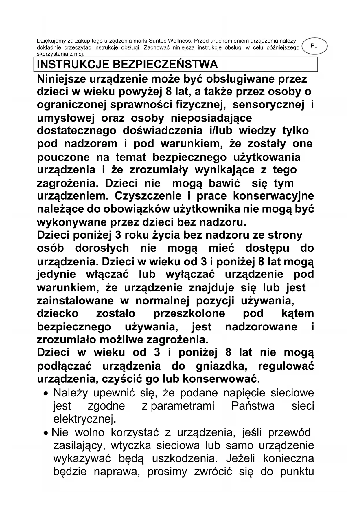 Niniejsze urządzenie może być obsługiwane przez dzieci w wieku powyżej 8 lat, a także przez osoby o ograniczonej sprawności fizycznej, sensorycznej i umysłowej oraz osoby nieposiadające dostatecznego doświadczenia i/lub wiedzy tylko pod nadzorem i pod warunkiem, że zostały one pouczone na temat bezpiecznego użytkowania urządzenia i że zrozumiały wynikające z tego zagrożenia. Dzieci nie mogą bawić się tym urządzeniem. Czyszczenie i prace konserwacyjne należące do obowiązków użytkownika nie mogą być wykonywane przez dzieci bez nadzoru. Dzieci poniżej 3 roku życia bez nadzoru ze strony osób dorosłych nie mogą mieć dostępu do urządzenia. Dzieci w wieku od 3 i poniżej 8 lat mogą jedynie włączać lub wyłączać urządzenie pod warunkiem, że urządzenie znajduje się lub jest zainstalowane w normalnej pozycji używania, dziecko zostało przeszkolone pod kątem bezpiecznego używania, jest nadzorowane i zrozumiało możliwe zagrożenia. Dzieci w wieku od 3 i poniżej 8 lat nie mogą podłączać urządzenia do gniazdka, regulować urządzenia, czyścić go lub konserwować.