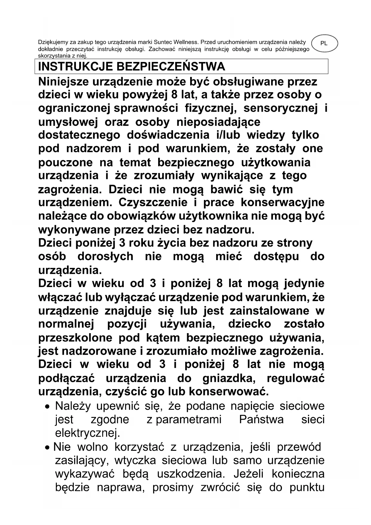 Niniejsze urządzenie może być obsługiwane przez dzieci w wieku powyżej 8 lat, a także przez osoby o ograniczonej sprawności fizycznej, sensorycznej i umysłowej oraz osoby nieposiadające dostatecznego doświadczenia i/lub wiedzy tylko pod nadzorem i pod warunkiem, że zostały one pouczone na temat bezpiecznego użytkowania urządzenia i że zrozumiały wynikające z tego zagrożenia. Dzieci nie mogą bawić się tym urządzeniem. Czyszczenie i prace konserwacyjne należące do obowiązków użytkownika nie mogą być wykonywane przez dzieci bez nadzoru. Dzieci poniżej 3 roku życia bez nadzoru ze strony osób dorosłych nie mogą mieć dostępu do urządzenia. Dzieci w wieku od 3 i poniżej 8 lat mogą jedynie włączać lub wyłączać urządzenie pod warunkiem, że urządzenie znajduje się lub jest zainstalowane w normalnej pozycji używania, dziecko zostało przeszkolone pod kątem bezpiecznego używania, jest nadzorowane i zrozumiało możliwe zagrożenia. Dzieci w wieku od 3 i poniżej 8 lat nie mogą podłączać urządzenia do gniazdka, regulować urządzenia, czyścić go lub konserwować.