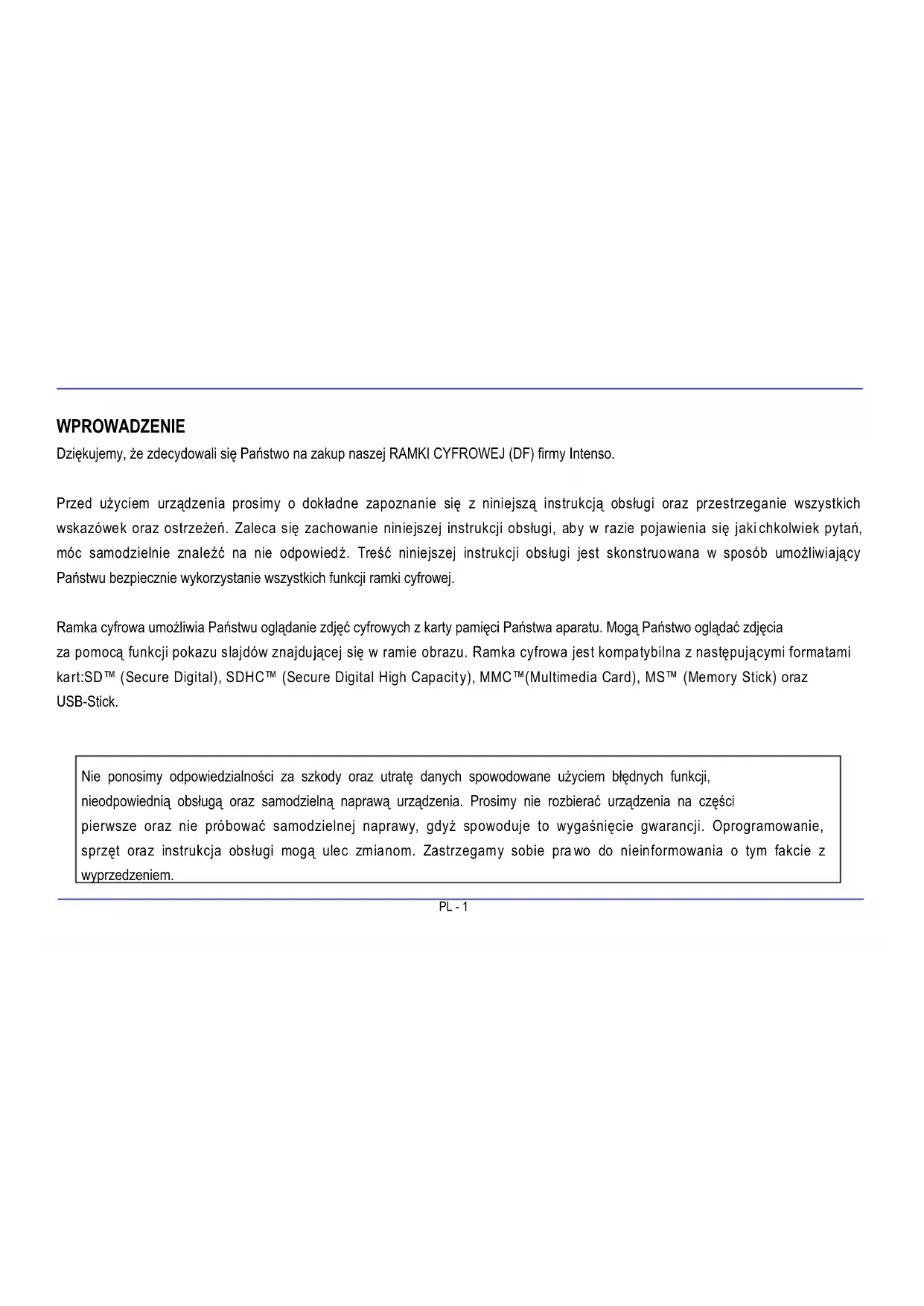 Przed uzyciem urzadzenia prosimy o dokladne zapoznanie sie z niniejsza instrukcja obslugi oraz przyestrzeganie wszystkich wskazowek oraz ostrzezenia. Zaleca sie zachowanie niniejszej instrukcji obslugi, aby w razie pojawenia sie jakichkolwiek pytań, moc samodzielnie znaleźna nie odpowiedź. Treśc niniejszej instrukcji obslugi jest skonstruowana w sposob uzolwiajczy Państwu bezpiecznych wykorzystanie wszystkich funkcjramki cyfrowej.