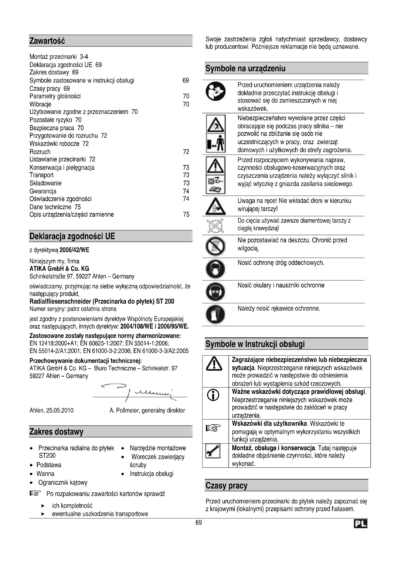 Deklaracja zgodności UE z dyrektywą 2006/42/WE Niniejszym my, firma ATIKA GmbH & Co. KG Schinkelstraße 97, 59227 Ahlen – Germany oświadczamy, przyjmując na siebie wyłączną odpowiedzialność, że następujący produkt, Radialfliesenschneider (Przecinarka do płytek) ST 200 Numer seryjny: patrz ostatnia strona jest zgodny z postanowieniami dyrektyw Wspólnoty Europejskiej oraz następujących, innych dyrektyw: 2004/108/WE i 2006/95/WE. Zastosowane zostały następujące normy zharmonizowane: EN 12418:2000+A1; EN 60825-1:2007; EN 55014-1:2006; EN 55014-2/A1:2001; EN 61000-3-2:2006; EN 61000-3-3/A2:2005 Przechowywanie dokumentacji technicznej: ATIKA GmbH & Co. KG – Biuro Techniczne – Schinkelstr. 97 59227 Ahlen – Germany Ahlen, 25.05.2010 A. Pollmeier, generalny direktor