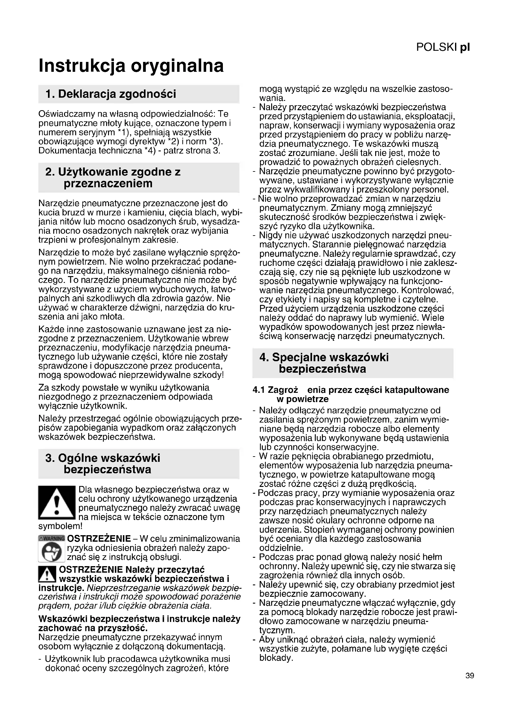 Instrukcja oryginalna Oświadczamy na własną odpowiedzialność: Te pneumatyczne młoty kujące, oznaczone typem i numerem seryjnym *1), spełniają wszystkie obowiązujące wymogi dyrektyw *2) i norm *3). Dokumentacja techniczna *4) - patrz strona 3. Narzędzie pneumatyczne przeznaczone jest do kucia bruzd w murze i kamieniu, cięcia blach, wybi- jania nitów lub mocno osadzonych śrub, wysadza- nia mocno osadzonych nakrętek oraz wybijania trzpieni w profesjonalnym zakresie. Narzędzie to może być zasilane wyłącznie sprężo- nym powietrzem. Nie wolno przekraczać podane- go na narzędziu, maksymalnego ciśnienia robo- czego. To narzędzie pneumatyczne nie może być wykorzystywane z użyciem wybuchowych, łatwo- palnych ani szkodliwych dla zdrowia gazów. Nie używać w charakterze dźwigni, narzędzia do kru- szenia ani jako młota. Każde inne zastosowanie uznawane jest za nie- zgodne z przeznaczeniem. Użytkowanie wbrew przeznaczeniu, modyfikacje narzędzia pneuma- tycznego lub używanie części, które nie zostały sprawdzone i dopuszczone przez producenta, mogą spowodować nieprzewidywalne szkody! Za szkody powstałe w wyniku użytkowania niezgodnego z przeznaczeniem odpowiada wyłącznie użytkownik. Należy przestrzegać ogólnie obowiązujących prze- pisów zapobiegania wypadkom oraz załączonych wskazówek bezpieczeństwa. Dla własnego bezpieczeństwa oraz w celu ochrony użytkowanego urządzenia pneumatycznego należy zwracać uwagę na miejsca w tekście oznaczone tym symbolem! OSTRZEŻENIE – W celu zminimalizowania ryzyka odniesienia obrażeń należy zapo- znać się z instrukcją obsługi. OSTRZEŻENIE Należy przeczytać wszystkie wskazówki bezpieczeństwa i instrukcje. Nieprzestrzeganie wskazówek bezpie- czeństwa i instrukcji może spowodować porażenie prądem, pożar i/lub ciężkie obraż enia ciała. Wskazówki bezpieczeństwa i instrukcje należy zachować na przyszłość. Narzędzie pneumatyczne przekazywać innym osobom wyłącznie z dołączoną dokumentacją. -Użytkownik lub pracodawca użytkownika musi dokonać oceny szczególnych zagrożeń, które mogą wystąpić ze względu na wszelkie zastoso- wania. -Należy przeczytać wskazówki bezpieczeństwa przed przystąpieniem do ustawiania, eksploatacji, napraw, konserwacji i wymiany wyposażenia oraz przed przystąpieniem do pracy w pobliżu narzę- dzia pneumatycznego. Te wskazówki muszą zostać zrozumiane. Jeśli tak nie jest, może to prowadzić to poważnych obrażeń cielesnych. -Narzędzie pneumatyczne powinno być przygoto- wywane, ustawiane i wykorzystywane wyłącznie przez wykwalifikowany i przeszkolony personel. - Nie wolno przeprowadzać zmian w narzędziu pneumatycznym. Zmiany mogą zmniejszyć skuteczność środków bezpieczeństwa i zwięk- szyć ryzyko dla użytkownika. -Nigdy nie używać uszkodzonych narzędzi pneu- matycznych. Starannie pielęgnować narzędzia pneumatyczne. Należy regularnie sprawdzać, czy ruchome części działają prawidłowo i nie zaklesz- czają się, czy nie są pęknięte lub uszkodzone w sposób negatywnie wpływający na funkcjono- wanie narzędzia pneumatycznego. Kontrolować, czy etykiety i napisy są kompletne i czytelne. Przed użyciem urządzenia uszkodzone części należy oddać do naprawy lub wymienić. Wiele wypadków spowodowanych jest przez niewła- ściwą konserwację narzędzi pneumatycznych.