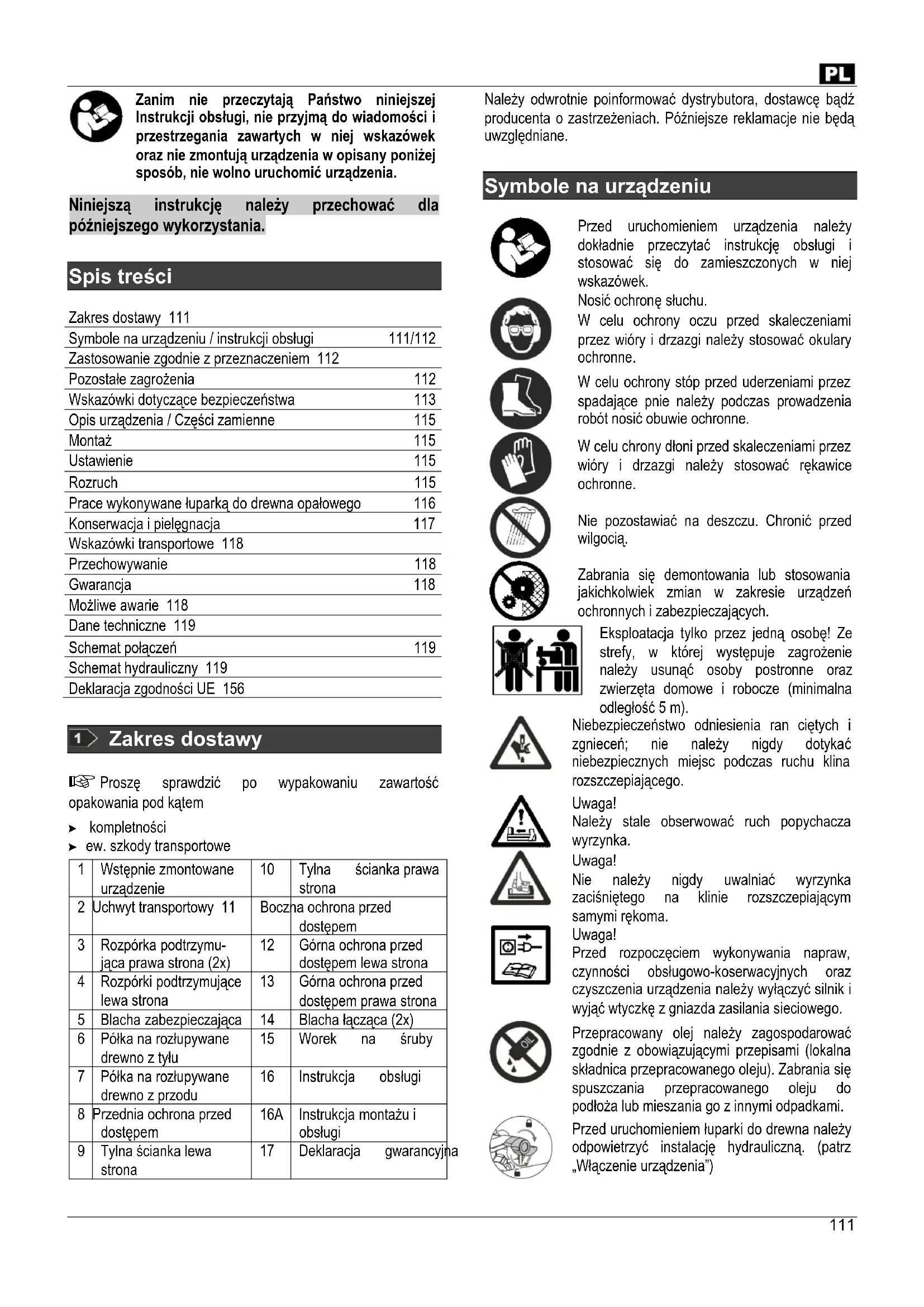 Spis treści Zakres dostawy 111 Symbole na urządzeniu / instrukcji obsługi 111/112 Zastosowanie zgodnie z przeznaczeniem 112 Pozostałe zagrożenia 112 Wskazówki dotyczące bezpieczeństwa 113 Opis urządzenia / Części zamienne 115 Montaż 115 Ustawienie 115 Rozruch 115 Prace wykonywane łuparką do drewna opałowego 116 Konserwacja i pielęgnacja 117 Wskazówki transportowe 118 Przechowywanie 118 Gwarancja 118 Możliwe awarie 118 Dane techniczne 119 Schemat połączeń 119 Schemat hydrauliczny 119 Deklaracja zgodności UE 156