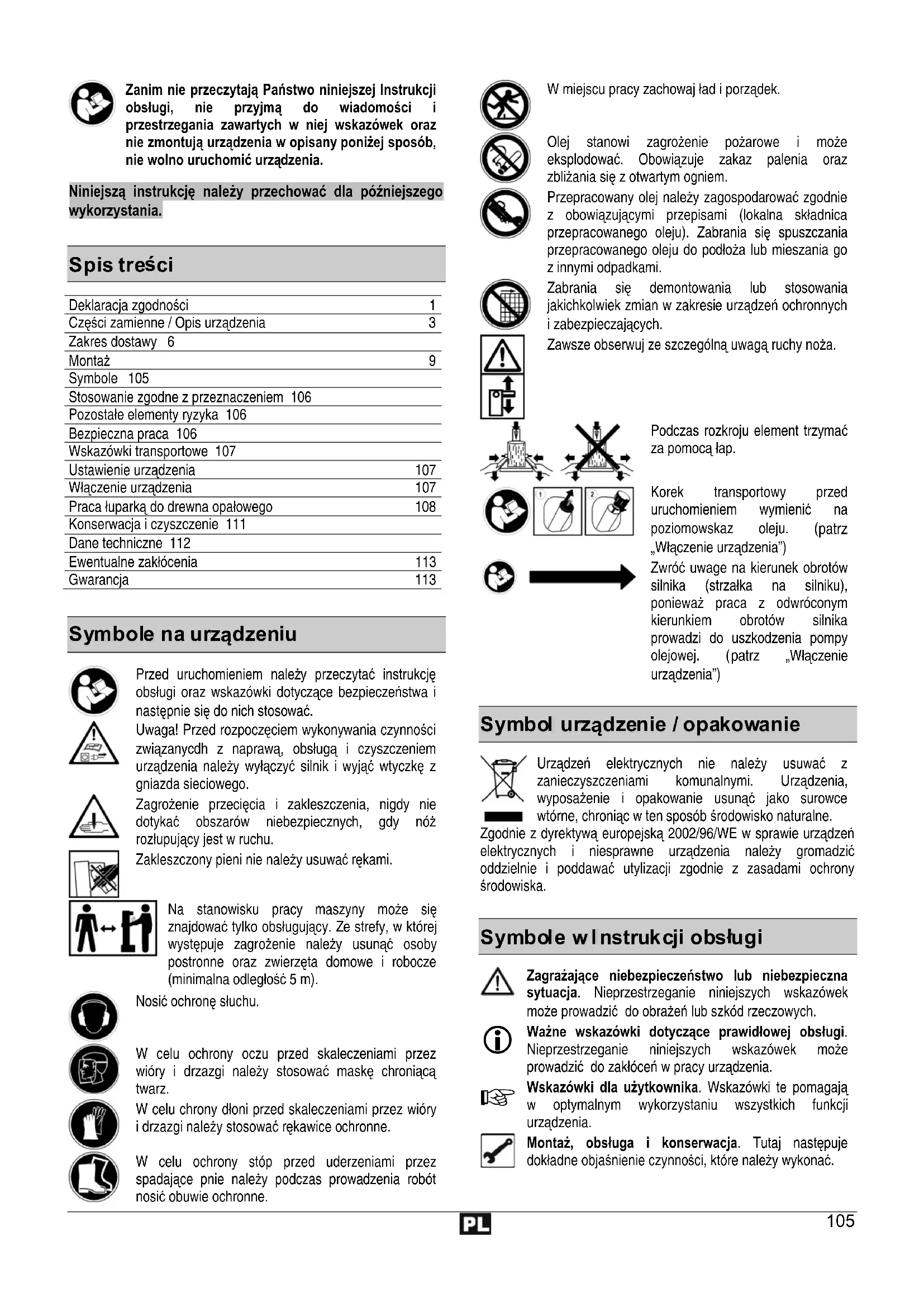 Deklaracja zgodności 1 Części zamienne / Opis urządzenia 3 Zakres dostawy 6 Montaż 9 Symbole 105 Stosowanie zgodne z przeznaczeniem 106 Pozostałe elementy ryzyka 106 Bezpieczna praca 106 Wskazówki transportowe 107 Ustawienie urządzenia 107 Włączenie urządzenia 107 Praca łuparką do drewna opałowego 108 Konserwacja i czyszczenie 111 Dane techniczne 112 Ewentualne zakłócenia 113 Gwarancja 113