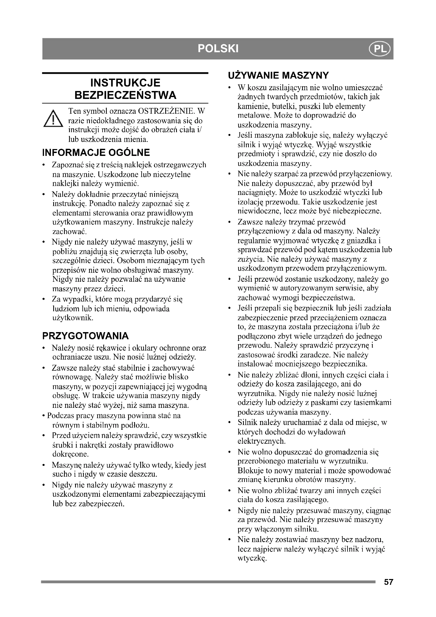 - Nie należy zostawiać maszyny bez nadzoru, lecz najpierw należy wyłączyć silnik i wyjąć wtyczkę.58 POLSKI