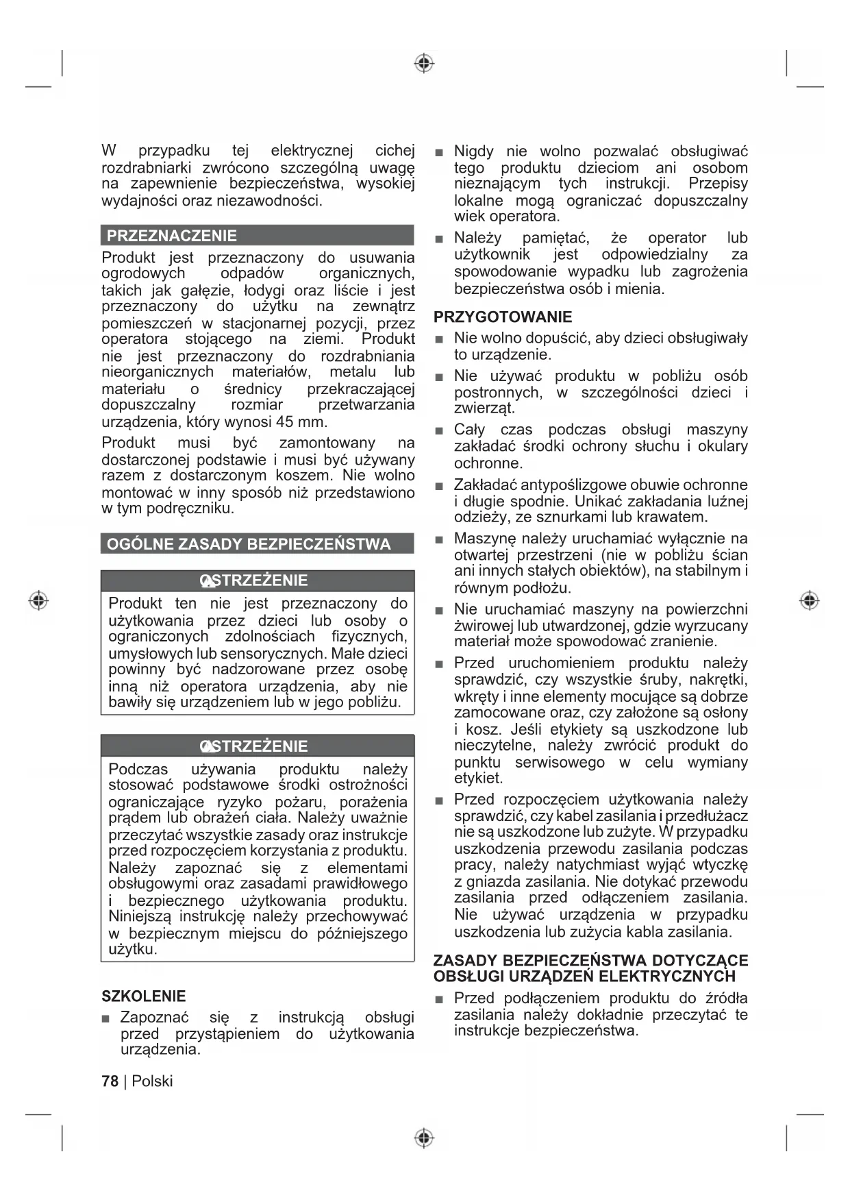14 2778 | Polski W przypadku tej elektrycznej cichej rozdrabniarki zwrócono szczególną uwagę na zapewnienie bezpieczeństwa, wysokiej wydajności oraz niezawodności. PRZEZNACZENIE Produkt jest przeznaczony do usuwania ogrodowych odpadów organicznych, takich jak gałęzie, łodygi oraz liście i jest przeznaczony do użytku na zewnątrz pomieszczeń w stacjonarnej pozycji, przez operatora stojącego na ziemi. Produkt nie jest przeznaczony do rozdrabniania nieorganicznych materiałów, metalu lub materiału o średnicy przekraczającej dopuszczalny rozmiar przetwarzania urządzenia, który wynosi 45 mm. Produkt musi być zamontowany na dostarczonej podstawie i musi być używany razem z dostarczonym koszem. Nie wolno montować w inny sposób niż przedstawiono w tym podręczniku.