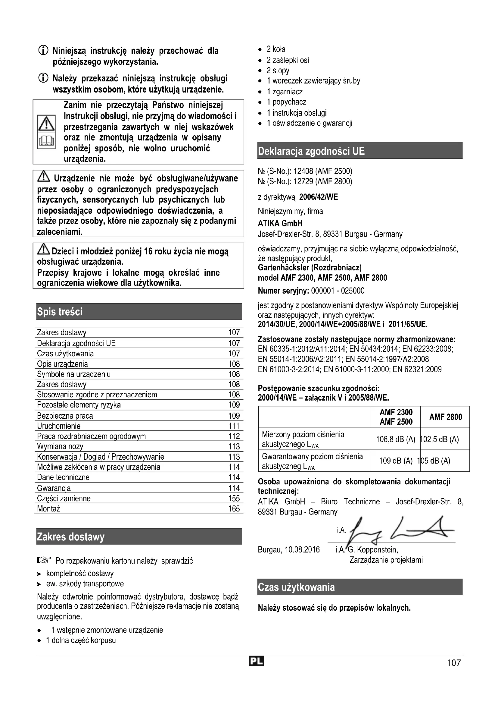 109 dB (A) 105 dB (A) Osoba upoważniona do skompletowania dokumentacji technicznej: ATIKA GmbH – Biuro Techniczne – Josef-Drexler-Str. 8, 89331 Burgau - Germany i.A. Burgau, 10.08.2016 i.A. G. Koppenstein, Zarządzanie projektami