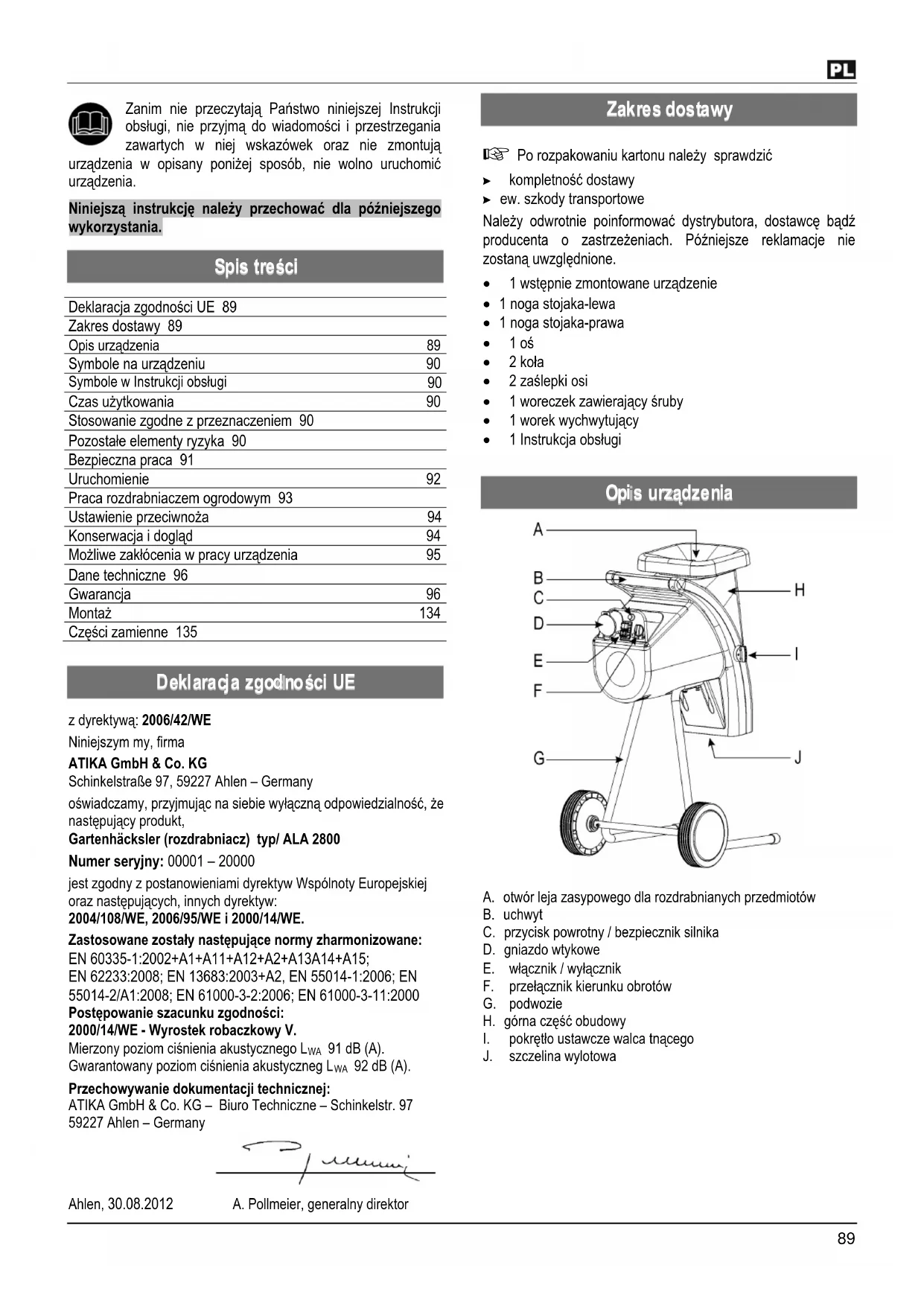 z dyrektywą: 2006/42/WE Niniejszym my, firma ATIKA GmbH & Co. KG Schinkelstraße 97, 59227 Ahlen – Germany oświadczamy, przyjmując na siebie wyłączną odpowiedzialność, że następujący produkt, Gartenhäcksler (rozdrabniacz) typ/ ALA 2800 Numer seryjny: 00001 – 20000 jest zgodny z postanowieniami dyrektyw Wspólnoty Europejskiej oraz następujących, innych dyrektyw: 2004/108/WE, 2006/95/WE i 2000/14/WE. Zastosowane zostały następujące normy zharmonizowane: EN 60335-1:2002+A1+A11+A12+A2+A13A14+A15; EN 62233:2008; EN 13683:2003+A2, EN 55014-1:2006; EN 55014-2/A1:2008; EN 61000-3-2:2006; EN 61000-3-11:2000 Postępowanie szacunku zgodności: 2000/14/WE - Wyrostek robaczkowy V. Mierzony poziom ciśnienia akustycznego L