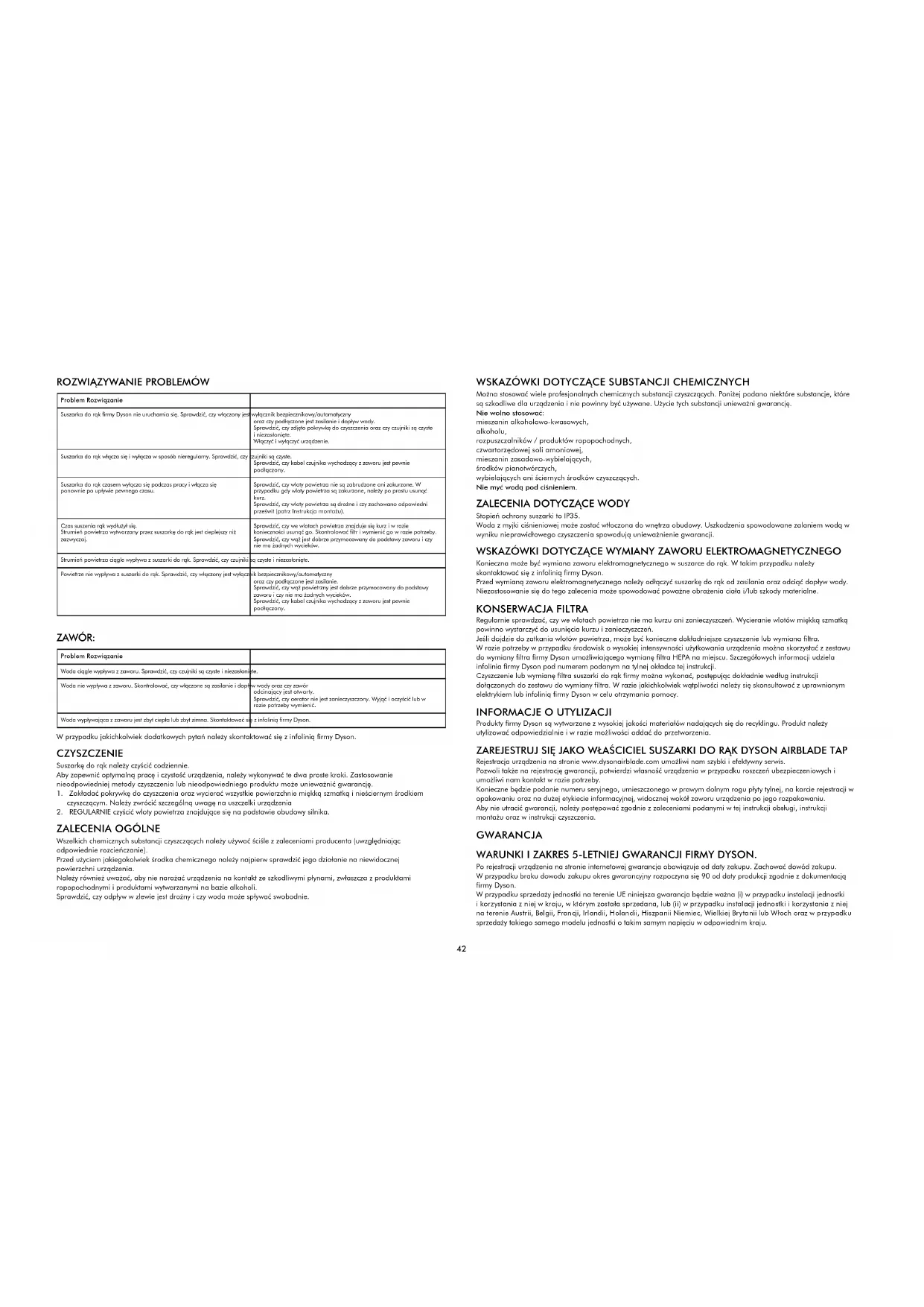 Produkty firmy Dyson są wytwarzane z wysokiej jakości materiałów nadających się do recyklingu. Produkt należy utylizować odpowiedzialnie i w razie możliwości oddać do przetworzenia. ZAREJESTRUJ SIĘ JAKO WŁAŚCICIEL SUSZARKI DO RĄK DYSON AIRBLADE TAP Rejestracja urządzenia na stronie www.dysonairblade.com umożliwi nam szybki i efektywny serwis. Pozwoli także na rejestrację gwarancji, potwierdzi własność urządzenia w przypadku roszczeń ubezpieczeniowych i umożliwi nam kontakt w razie potrzeby. Konieczne będzie podanie numeru seryjnego, umieszczonego w prawym dolnym rogu płyty tylnej, na karcie rejestracji w opakowaniu oraz na dużej etykiecie informacyjnej, widocznej wokół zaworu urządzenia po jego rozpakowaniu. Aby nie utracić gwarancji, należy postępować zgodnie z zaleceniami podanymi w tej instrukcji obsługi, instrukcji montażu oraz w instrukcji czyszczenia. GWARANCJA WARUNKI I ZAKRES 5-LETNIEJ GWARANCJI FIRMY DYSON. Po rejestracji urządzenia na stronie internetowej gwarancja obowiązuje od daty zakupu. Zachować dowód zakupu. Wprzypadku braku dowodu zakupu okres gwarancyjny rozpoczyna się 90 od daty produkcji zgodnie z dokumentacją firmy Dyson. W przypadku sprzedaży jednostki na terenie UE niniejsza gwarancja będzie ważna (i) w przypadku instalacji jednostki i korzystania z niej w kraju, w którym została sprzedana, lub (ii) w przypadku instalacji jednostki i korzystania z niej na terenie Austrii, Belgii, Francji, Irlandii, Holandii, Hiszpanii Niemiec, Wielkiej Brytanii lub Włoch oraz w przypadku sprzedaży takiego samego modelu jednostki o takim samym napięciu w odpowiednim kraju.43 W przypadku sprzedaży jednostki poza granicami UE niniejsza gwarancja będzie ważna jednie w przypadku instalacji jednostki i korzystania z niej w kraju, w którym została sprzedana. GWARANCJA OBEJMUJE: 5-Letnia Gwarancja Wszystkie montowane fabrycznie elementy suszarki do rąk będą sprawne i wolne od wad materiałowych oraz produkcyjnych przez pięć lat od początku okresu gwarancyjnego w przypadku użytkowania urządzenia zgodnie z wytycznymi podanymi w instrukcji i podręczniku montażu dla użytkownika. Szczegółowych informacji udziela infolinia Dyson. W przypadku awarii elektrycznej firma Dyson przeprowadzi w trakcie okresu gwarancyjnego naprawę bez pobierania opłaty za robociznę. Wymiana zaworu, obudowy silnika, filtra ani elektrozaworu nie jest objęta robocizną. W przypadku awarii wymienione części zostaną dostarczone do zamontowania na miejscu eksploatacji przez Klienta. Aby uzyskać szczegółowe informacje, należy skontaktować się z Infolinią Dyson.
