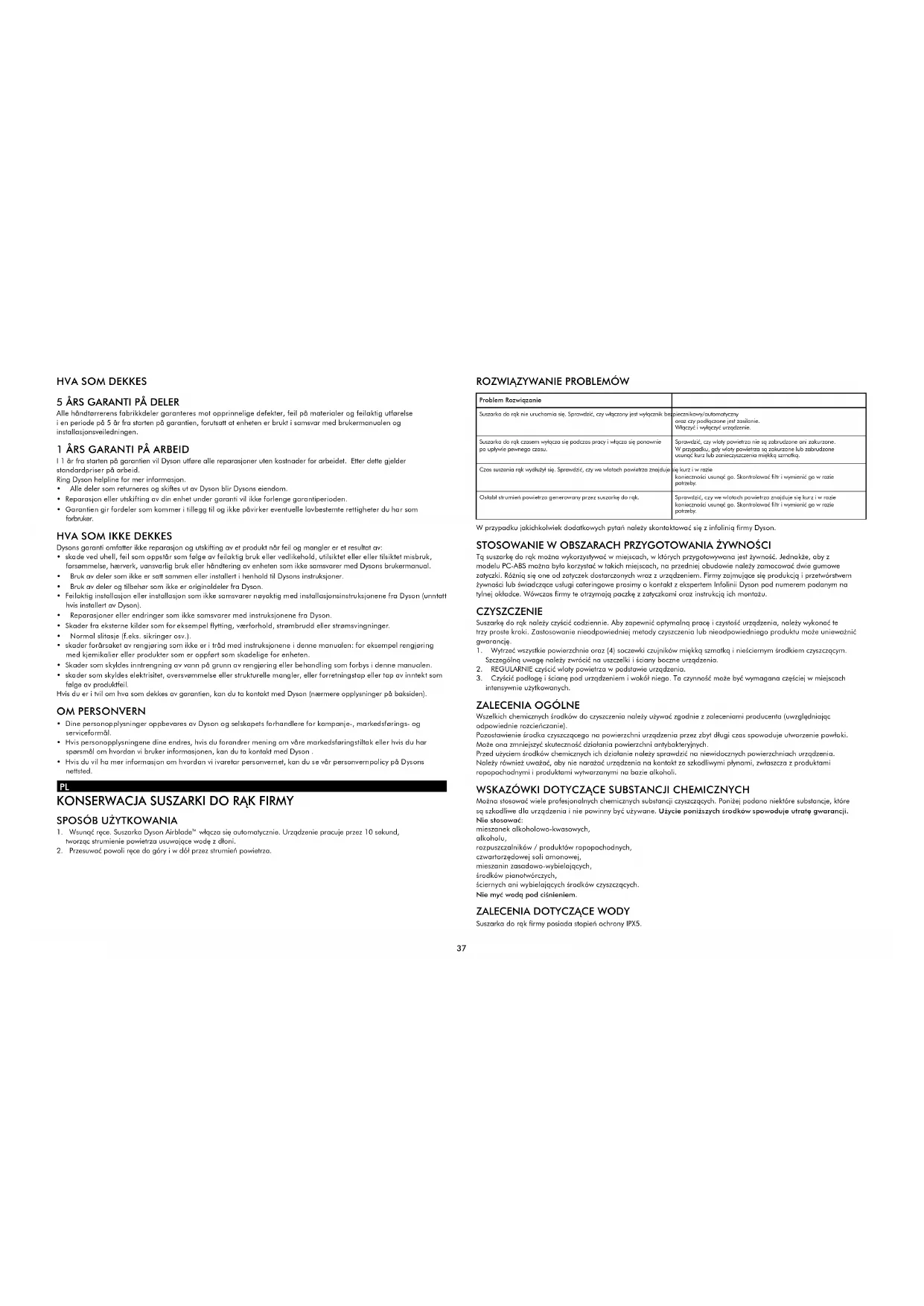 Problem RozwiązanieSuszarka do rąk nie uruchamia się. Sprawdzić, czy włączony jest wyłącznik bezpiecznikowy/automatyczny oraz czy podłączone jest zasilanie.Włączyć i wyłączyć urządzenie.Suszarka do rąk czasem wyłącza się podczas pracy i włącza się ponownie po upływie pewnego czasu.Sprawdzić, czy wloty powietrza nie są zabrudzone ani zakurzone. W przypadku, gdy wloty powietrza są zakurzone lub zabrudzone usunąć kurz lub zanieczyszczenia miękką szmatką.Czas suszenia rąk wydłużył się. Sprawdzić, czy we wlotach powietrza znajduje się kurz i w razie konieczności usunąć go. Skontrolować filtr i wymienić go w razie potrzeby. Osłabł strumień powietrza generowany przez suszarkę do rąk. Sprawdzić, czy we wlotach powietrza znajduje się kurz i w razie konieczności usunąć go. Skontrolować filtr i wymienić go w razie potrzeby. W przypadku jakichkolwiek dodatkowych pytań należy skontaktować się z infolinią firmy Dyson.