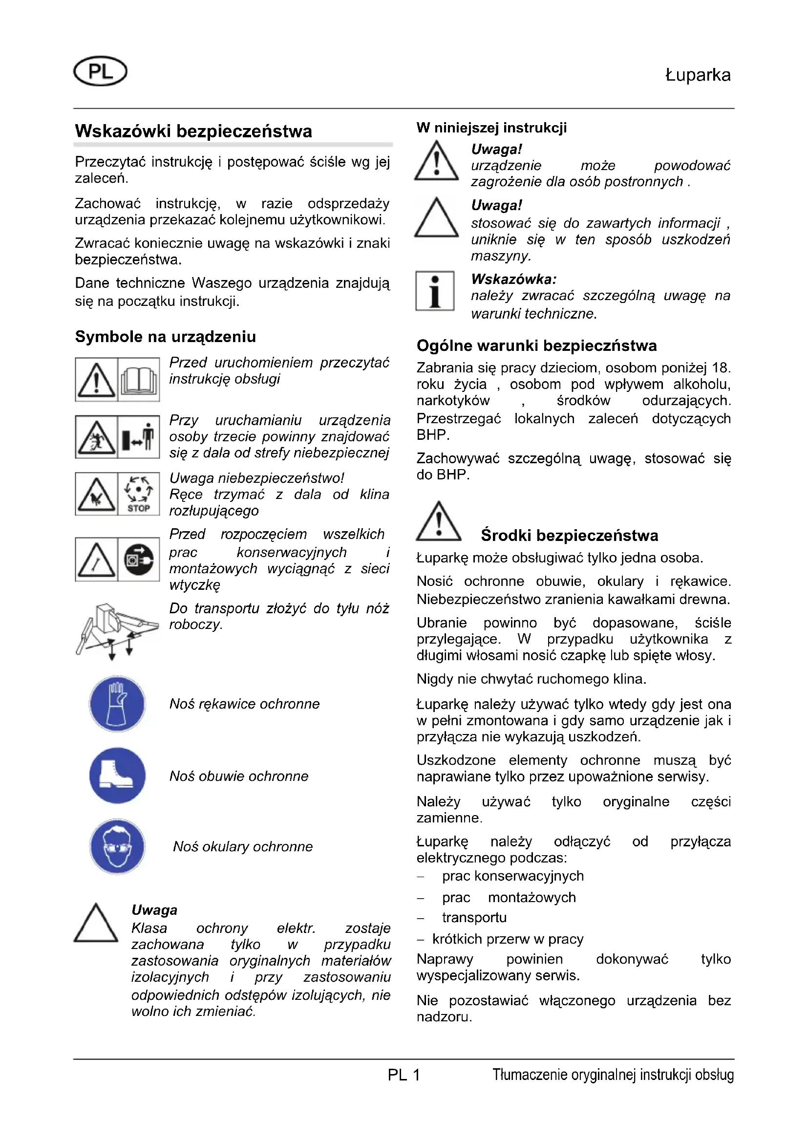 Uwaga Klasa ochrony elektr. zostaje zachowana tylko w przypadku zastosowania oryginalnych materiałów izolacyjnych i przy zastosowaniu odpowiednich odstępów izolujących, nie wolno ich zmieniać. W niniejszej instrukcji Uwaga! urządzenie może powodować zagrożenie dla osób postronnych . Uwaga! stosować się do zawartych informacji , uniknie się w ten sposób uszkodzeń maszyny. Wskazówka: należy zwracać szczególną uwagę na warunki techniczne. Ogólne warunki bezpieczństwa Zabrania się pracy dzieciom, osobom poniżej 18. roku życia , osobom pod wpływem alkoholu, narkotyków , środków odurzających. Przestrzegać lokalnych zaleceń dotyczących BHP. Zachowywać szczególną uwagę, stosować się do BHP. Środki bezpieczeństwa Łuparkę może obsługiwać tylko jedna osoba. Nosić ochronne obuwie, okulary i rękawice. Niebezpieczeństwo zranienia kawałkami drewna. Ubranie powinno być dopasowane, ściśle przylegające. W przypadku użytkownika z długimi włosami nosić czapkę lub spięte włosy. Nigdy nie chwytać ruchomego klina. Łuparkę należy używać tylko wtedy gdy jest ona w pełni zmontowana i gdy samo urządzenie jak i przyłącza nie wykazują uszkodzeń. Uszkodzone elementy ochronne muszą być naprawiane tylko przez upoważnione serwisy. Należy używać tylko oryginalne części zamienne. Łuparkę należy odłączyć od przyłącza elektrycznego podczas: − prac konserwacyjnych − prac montażowych − transportu − krótkich przerw w pracy Naprawy powinien dokonywać tylko wyspecjalizowany serwis. Nie pozostawiać włączonego urządzenia bez nadzoru. Tłumaczenie oryginalnej instrukcji obsługŁuparka PL 2 Nie uruchamiać urządzenia w obecności osób postronnych. Nie używać łuparki w trakcie deszczu, nie pozostawiać jej na deszczu, nie polewać wodą – niebezpieczeństwo porażenia prądem. Nie wolno przebywać w pobliżu urządzenia osobom postronnym, zwracać szczególną uwagę na dzieci i zwierzęta. Obsługujący ponosi pełną własną odpowiedzialność za ewentualny wypadek z osobą postronną. Obszar roboczy utrzymywać w czystości i ładzie – niebezpieczeństwo potknięcia się. Zasady bezpiecznego użytkowania Wyłącznik przeciążeniowy W przypadku przeciążenia łuparki, wyłącznik przeciążeniowy wyłącza urządzenie. Nie wykorzystywać wyłącznika przeciążeniowego jako normalnego wyłącznika. Jeśli wyłącznik przeciążeniowy wyłączy urządzenie należy wtedy: