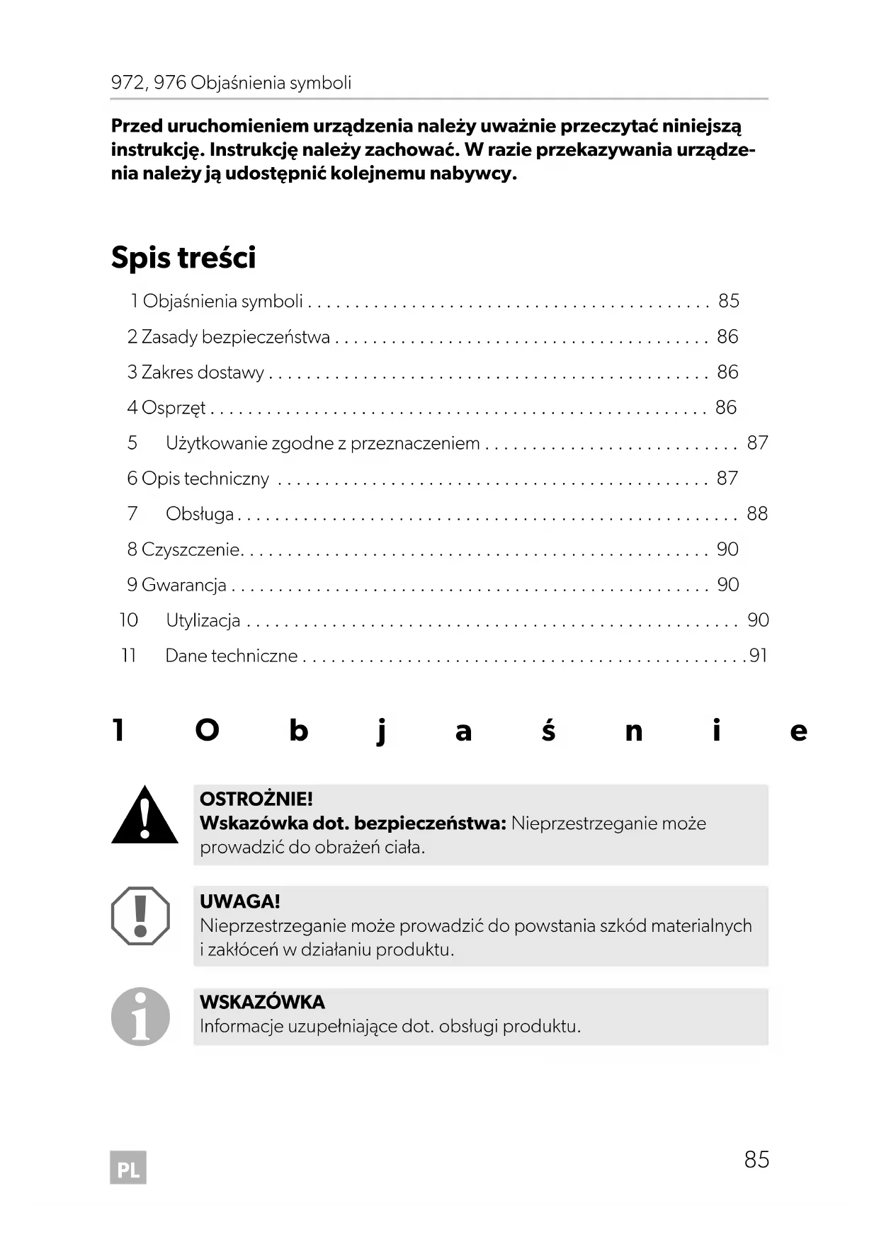 - Przed uruchomieniem urządzenia należy uważnie przeczytać niniejszą instrukcję. Instrukcję należy zachować. W razie przekazywania urządze- nia należy ją udostępnić kolejnemu nabywcy. Spis treści 1 Objaśnienia symboli p. 85