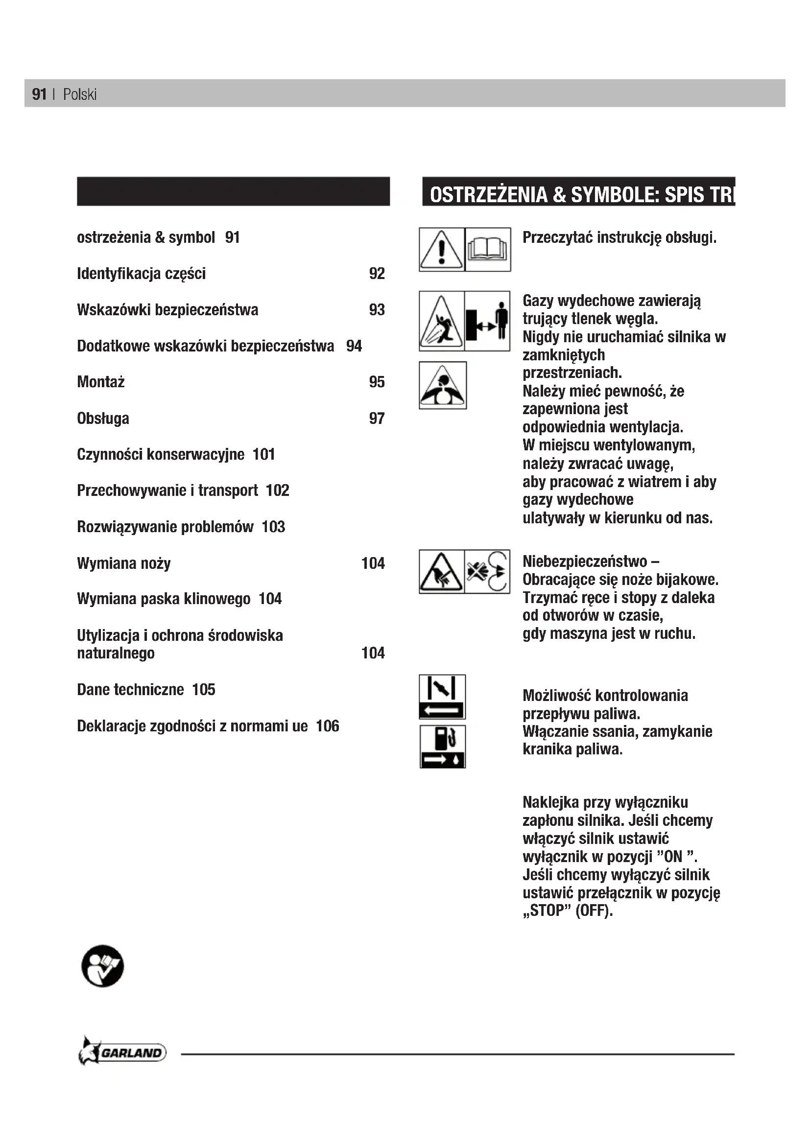 - Bezpieczentwo rak - nie wiktadaj rak ani nóg w lej rebarki badz Rozdrabniarki ani do kanału wyrzutowo podczas przy! Grozi wciąniewiem i obcieciem konczyn. NIE DOTYKAJ gorących częsci silnika