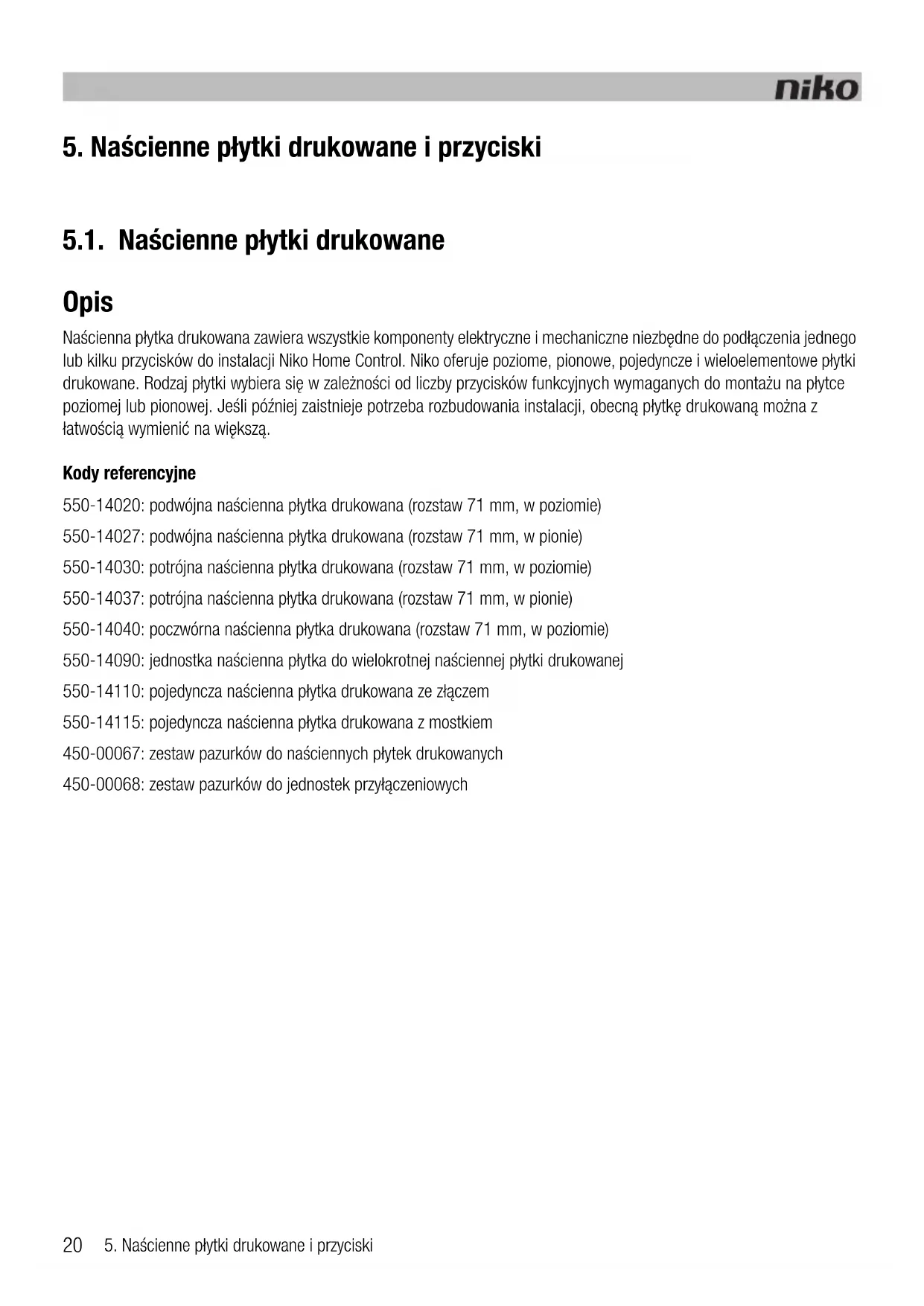 NaScienna pIytka drukowana zawiera wzystkie komponenty elektryczne i mechanizcne niezbedne do podlaczenia jegnog lub kilku przycisków do instalacji Niko Home Control. Niko oferuje poziome, pionowe, pojedyncze i wieloelementowe pIytki drukowane. Rodzaj pIytki wybiera sie w zaleznosci od liczby przycisków funkcyjnych wymaganych do montazu na pIytc poziomej lub pionowej. Jesli poźnej zaistnieje potrzeba rozbudowania instalacji, obecnay pIytke drukowanamozna z latwość wymienc na growsza.