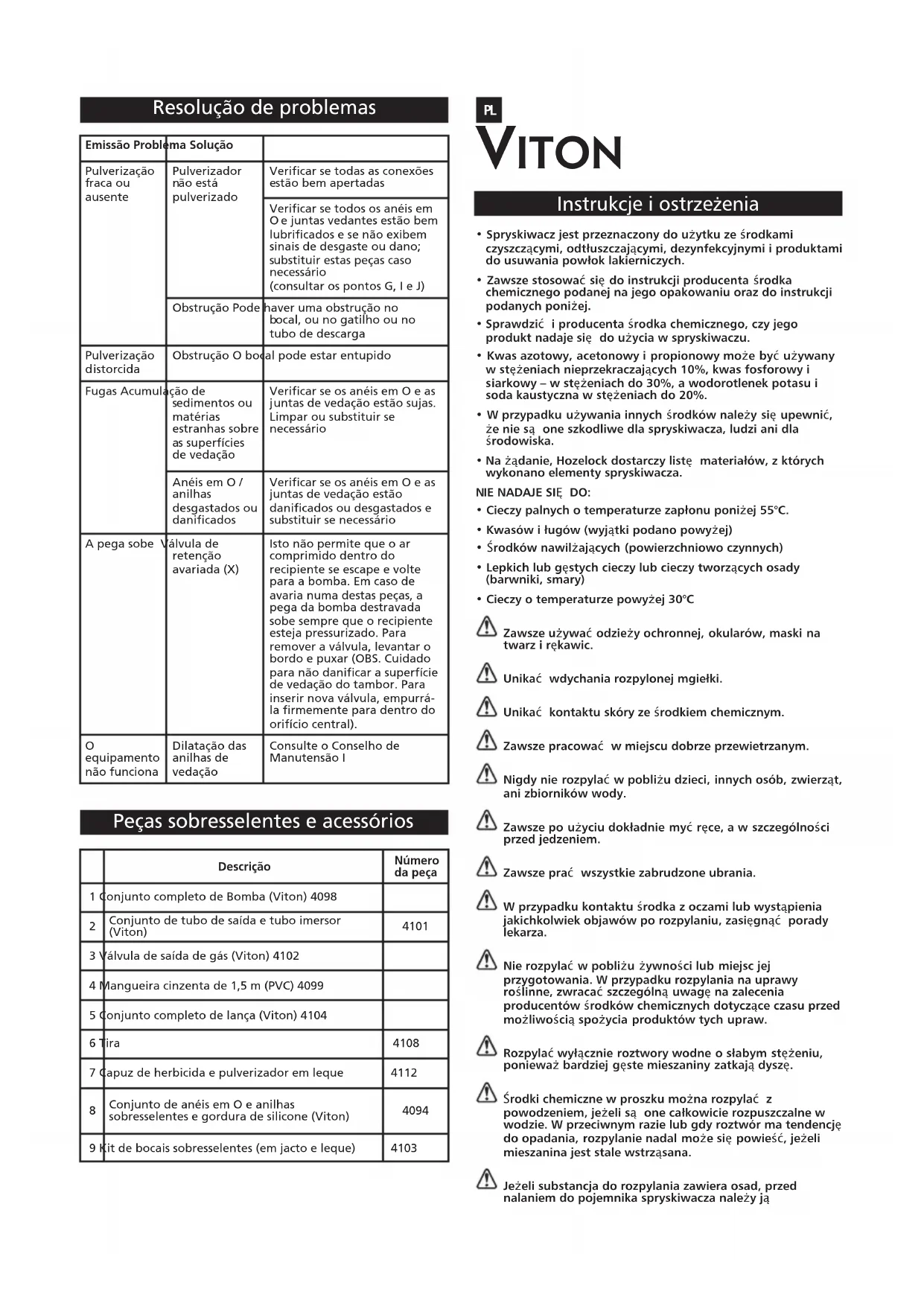 - Cieczy o temperaturze powyżej 30°C Zawsze używać odzieży ochronnej, okularów, maski na twarz i rękawic. Unikać wdychania rozpylonej mgiełki. Unikać kontaktu skóry ze środkiem chemicznym. Zawsze pracować w miejscu dobrze przewietrzanym. Nigdy nie rozpylać w pobliżu dzieci, innych osób, zwierząt, ani zbiorników wody. Zawsze po użyciu dokładnie myć ręce, a w szczególności przed jedzeniem. Zawsze prać wszystkie zabrudzone ubrania. W przypadku kontaktu środka z oczami lub wystąpienia jakichkolwiek objawów po rozpylaniu, zasięgnąć porady lekarza. Nie rozpylać w pobliżu żywności lub miejsc jej przygotowania. W przypadku rozpylania na uprawy roślinne, zwracać szczególną uwagę na zalecenia producentów środków chemicznych dotyczące czasu przed możliwością spożycia produktów tych upraw. Rozpylać wyłącznie roztwory wodne o słabym stężeniu, ponieważ bardziej gęste mieszaniny zatkają dyszę. Środki chemiczne w proszku można rozpylać z powodzeniem, jeżeli są one całkowicie rozpuszczalne w wodzie. W przeciwnym razie lub gdy roztwór ma tendencję do opadania, rozpylanie nadal może się powieść, jeżeli mieszanina jest stale wstrząsana. Jeżeli substancja do rozpylania zawiera osad, przed nalaniem do pojemnika spryskiwacza należy ją Peças sobresselentes e acessórios Resolução de problemas