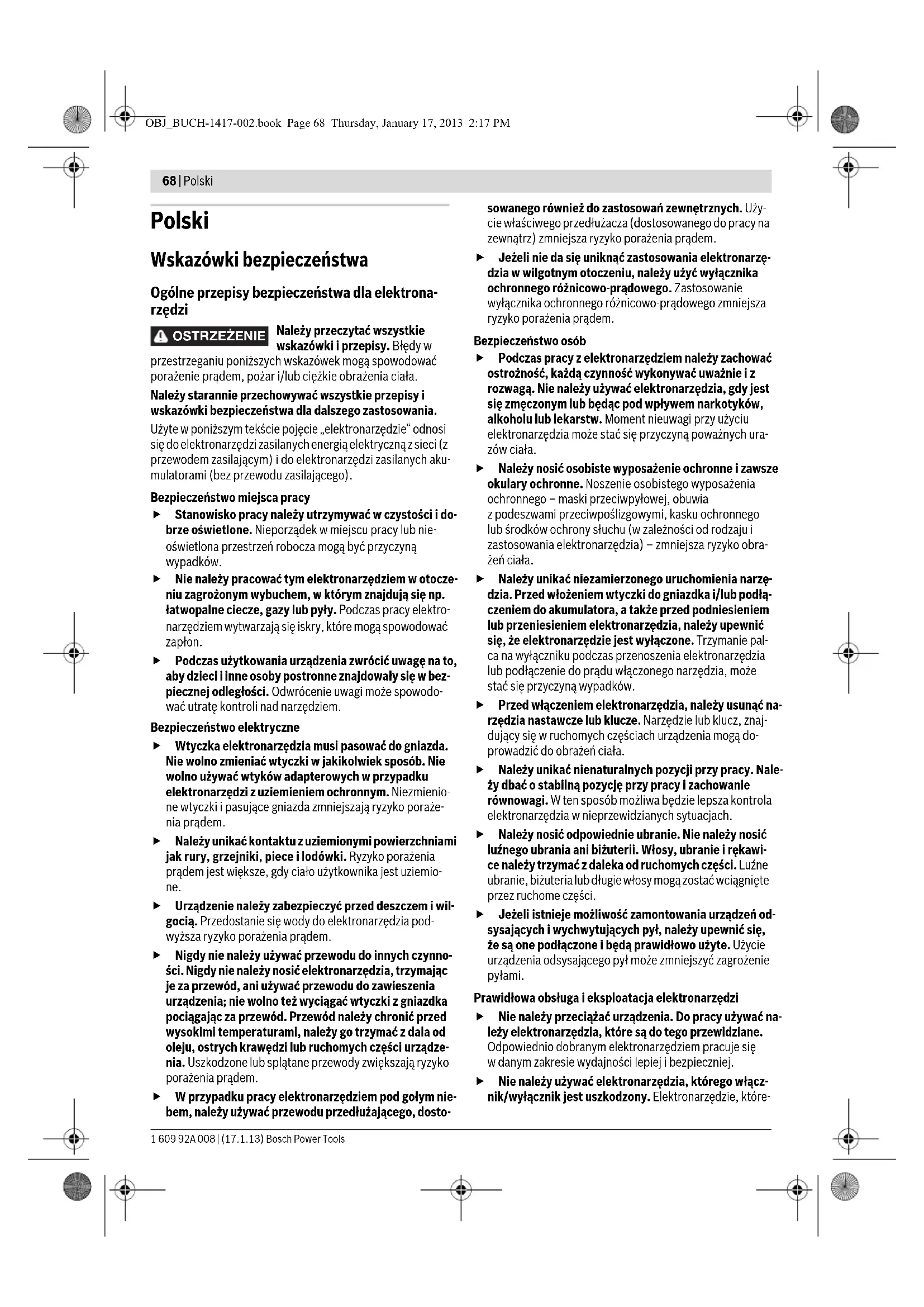Denizli Tel.: 0258 2620666 Bulut Elektrik İstasyon Cad. No: 52/B Devlet Tiyatrosu Karşısı Elazığ Tel.: 0424 2183559 Körfez Elektrik Sanayi Çarşısı 770 Sok. No: 71 Erzincan Tel.: 0446 2230959 Ege Elektrik İnönü Bulvaro No: 135 Muğla Makasarası Fethiye Fethiye Tel.: 0252 6145701 Değer İş Bobinaj İsmetpaşa Mah. İlk Belediye Başkan Cad. 5/C Şahinbey Gaziantep Tel.: 0342 2316432 Çözüm Bobinaj İsmetpaşa Mah. Eski Şahinbey Belediyesi altı Cad. No: 3/C Gaziantep Tel.: 0342 2319500 Onarım Bobinaj Raifpaşa Cad. No: 67 İskenderun Hatay Tel.: 0326 6137546 Günşah Otomotiv Beylikdüzü Sanayi Sit. No: 210 Beylikdüzü İstanbul Tel.: 0212 8720066 Aygem 10021 Sok. No: 11 AOSB Çiğli İzmir Tel.: 0232 3768074 Sezmen Bobinaj Ege İş Merkezi 1201/4 Sok. No: 4/B Yenişehir İzmir Tel.: 0232 4571465 Ankaralı Elektrik Eski Sanayi Bölgesi 3. Cad. No: 43 Kayseri Tel.: 0352 3364216 Asal Bobinaj Eski Sanayi Sitesi Barbaros Cad. No: 24 Samsun Tel.: 0362 2289090 Üstündağ Elektrikli Aletler Nusretiye Mah. Boyacılar Aralığı No: 9 Tekirdağ Tel.: 0282 6512884 Nakliye Alet içindeki lityum iyon (Li-Ionen) aküler tehlikeli madde taşı- ma yönetmeliği hükümlerine tabidir. Aküler başka bir yüküm- lülük olmaksızın kullanıcı tarafından caddeler üzerinde taşına- bilir. Üçüncü kişiler eliyle yollanma durumunda (örneğin hava yolu ile veya nakliye şirketleri ile) paketleme ve etiketlemeye ilişkin özel hükümlere uyulmalıdır. Bu nedenle gönderi paketlenir- ken bir tehlikeli madde uzmanından yardım alınmalıdır. Aküleri sadece ve ancak gövdelerinde hasar yoksa gönderin. Açık kontakları kapatın ve aküyü ambalaj içinde hareket etme- yecek biçimde paketleyin. Lütfen olası ek ulusal yönetmelik hükümlerine de uyun. Tasfiye Elektrikli el aletleri, aküler, aksesuar ve ambalaj mal- zemesi çevre dostu yeniden kazanım merkezine gön- derilmek zorundadır. Elektrikli el aletlerini ve aküleri/bataryaları evsel çöplerin içine atmayın! Sadece AB üyesi ülkeler için: 2002/96/AT yönetmeliği uyarınca kullanım ömrünü tamamlamış elektrikli el aletleri ve 2006/66/AT yönetmeliği uyarınca arızalı veya kullanım ömrünü tamamlamış akü- ler/bataryalar ayrı ayrı toplanmak ve çevre dostu tasfiye için bir geri dönüşüm merkezi- ne gönderilmek zorundadır. Aküler/Bataryalar: Li-Ion: Lütfen bölüm “Nakliye”, sayfa içindeki uyarılara uyun 67. Değişiklik haklarımız saklıdır. OBJ_BUCH-1417-002.book Page 67 Thursday, January 17, 2013 2:17 PM68 | Polski 1 609 92A 008 | (17.1.13) Bosch Power Tools Polski Wskazówki bezpieczeństwa Ogólne przepisy bezpieczeństwa dla elektrona- rzędzi Należy przeczytać wszystkie wskazówki i przepisy. Błędy w przestrzeganiu poniższych wskazówek mogą spowodować porażenie prądem, pożar i/lub ciężkie obrażenia ciała. Należy starannie przechowywać wszystkie przepisy i wskazówki bezpieczeństwa dla dalszego zastosowania. Użyte w poniższym tekście pojęcie „elektronarzędzie“ odnosi się do elektronarzędzi zasilanych energią elektryczną z sieci (z przewodem zasilającym) i do elektronarzędzi zasilanych aku- mulatorami (bez przewodu zasilającego). Bezpieczeństwo miejsca pracy Stanowisko pracy należy utrzymywać w czystości i do- brze oświetlone. Nieporządek w miejscu pracy lub nie- oświetlona przestrzeń robocza mogą być przyczyną wypadków. Nie należy pracować tym elektronarzędziem w otocze- niu zagrożonym wybuchem, w którym znajdują się np. łatwopalne ciecze, gazy lub pyły. Podczas pracy elektro- narzędziem wytwarzają się iskry, które mogą spowodować zapłon. Podczas użytkowania urządzenia zwrócić uwagę na to, aby dzieci i inne osoby postronne znajdowały się w bez- piecznej odległości. Odwrócenie uwagi może spowodo- wać utratę kontroli nad narzędziem. Bezpieczeństwo elektryczne Wtyczka elektronarzędzia musi pasować do gniazda. Nie wolno zmieniać wtyczki w jakikolwiek sposób. Nie wolno używać wtyków adapterowych w przypadku elektronarzędzi z uziemieniem ochronnym. Niezmienio- ne wtyczki i pasujące gniazda zmniejszają ryzyko poraże- nia prądem. Należy unikać kontaktu z uziemionymi powierzchniami jak rury, grzejniki, piece i lodówki. Ryzyko porażenia prądem jest większe, gdy ciało użytkownika jest uziemio- ne. Urządzenie należy zabezpieczyć przed deszczem i wil- gocią. Przedostanie się wody do elektronarzędzia pod- wyższa ryzyko porażenia prądem. Nigdy nie należy używać przewodu do innych czynno- ści. Nigdy nie należy nosić elektronarzędzia, trzymając je za przewód, ani używać przewodu do zawieszenia urządzenia; nie wolno też wyciągać wtyczki z gniazdka pociągając za przewód. Przewód należy chronić przed wysokimi temperaturami, należy go trzymać z dala od oleju, ostrych krawędzi lub ruchomych części urządze- nia. Uszkodzone lub splątane przewody zwiększają ryzyko porażenia prądem. W przypadku pracy elektronarzędziem pod gołym nie- bem, należy używać przewodu przedłużającego, dosto- sowanego również do zastosowań zewnętrznych. Uży- cie właściwego przedłużacza (dostosowanego do pracy na zewnątrz) zmniejsza ryzyko porażenia prądem. Jeżeli nie da się uniknąć zastosowania elektronarzę- dzia w wilgotnym otoczeniu, należy użyć wyłącznika ochronnego różnicowo-prądowego. Zastosowanie wyłącznika ochronnego różnicowo-prądowego zmniejsza ryzyko porażenia prądem. Bezpieczeństwo osób Podczas pracy z elektronarzędziem należy zachować ostrożność, każdą czynność wykonywać uważnie i z rozwagą. Nie należy używać elektronarzędzia, gdy jest się zmęczonym lub będąc pod wpływem narkotyków, alkoholu lub lekarstw. Moment nieuwagi przy użyciu elektronarzędzia może stać się przyczyną poważnych ura- zów ciała. Należy nosić osobiste wyposażenie ochronne i zawsze okulary ochronne. Noszenie osobistego wyposażeni