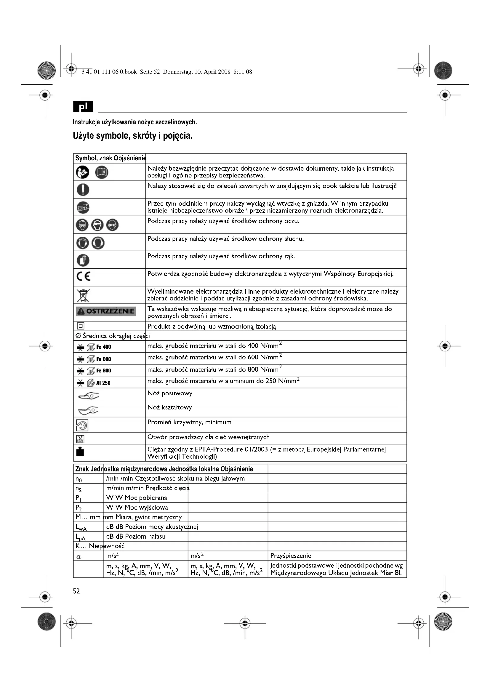 Instrukcja u˝ytkowania no˝yc szczelinowych. U˝yte symbole, skróty i poj´cia. Symbol, znak ObjaÊnienie Należy bezwzględnie przeczytać dołączone w dostawie dokumenty, takie jak instrukcja obsługi i ogólne przepisy bezpieczeństwa. Należy stosować się do zaleceń zawartych w znajdującym się obok tekście lub ilustracji! Przed tym odcinkiem pracy należy wyciągnąć wtyczkę z gniazda. W innym przypadku istnieje niebezpieczeństwo obrażeń przez niezamierzony rozruch elektronarzędzia. Podczas pracy należy używać środków ochrony oczu. Podczas pracy należy używać środków ochrony słuchu. Podczas pracy należy używać środków ochrony rąk. Potwierdza zgodność budowy elektronarzędzia z wytycznymi Wspólnoty Europejskiej. Wyeliminowane elektronarzędzia i inne produkty elektrotechniczne i elektryczne należy zbierać oddzielnie i poddać utylizacji zgodnie z zasadami ochrony środowiska. Ta wskazówka wskazuje możliwą niebezpieczną sytuację, która doprowadzić może do poważnych obrażeń i śmierci. Produkt z podwójną lub wzmocnioną izolacją Ø Średnica okrągłej części maks. grubość materiału w stali do 400 N/mm