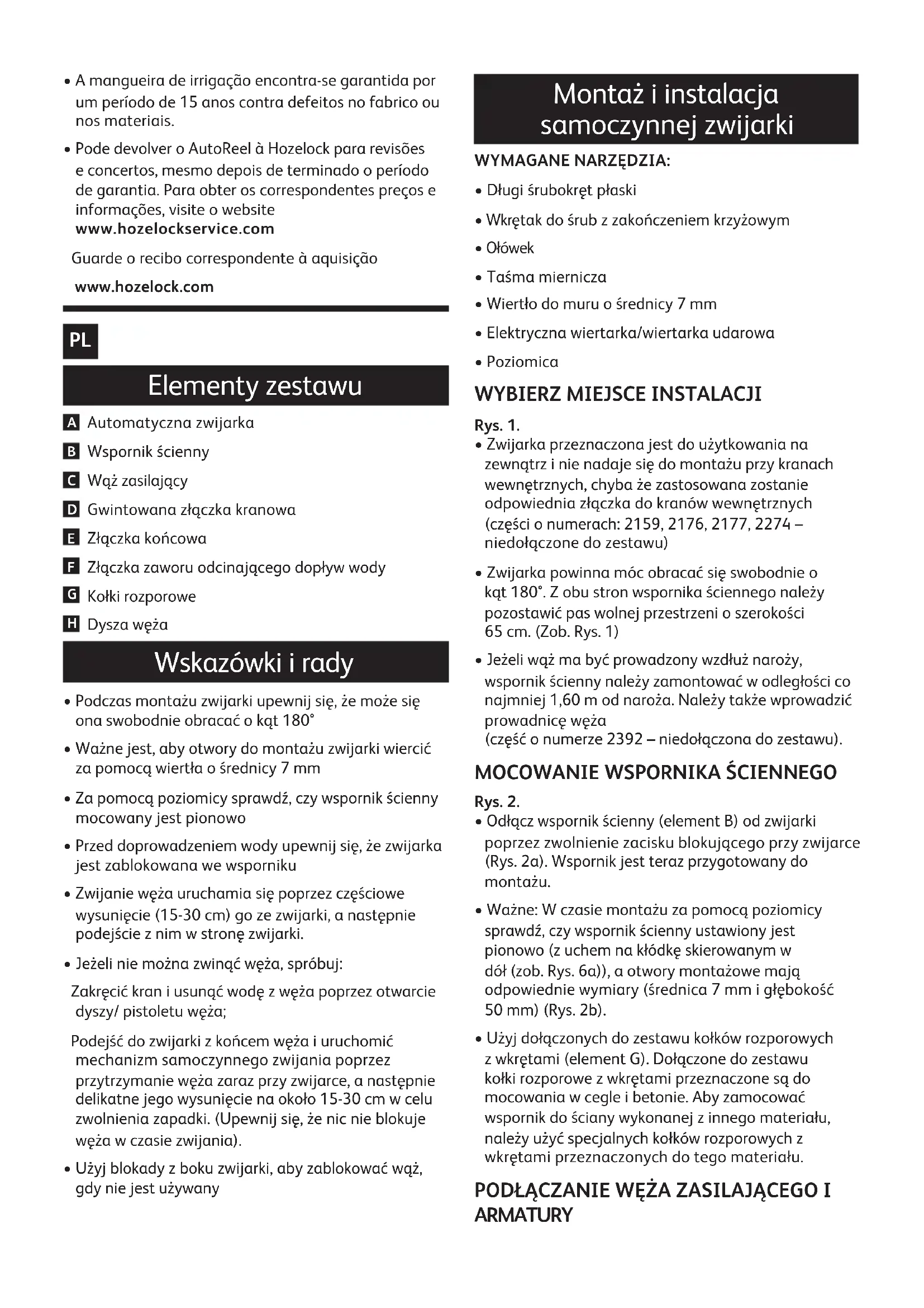 - W razie awarii mechanizmu samoczynnego zwijania, nawet jeżeli doszło do niej po upływie okresu gwarancyjnego, nie należy podejmować prób samodzielnej naprawy i demontażu. O pomoc zwróć się do działu obsługi klienta Hozelock. Częścizamienneiakcesoria