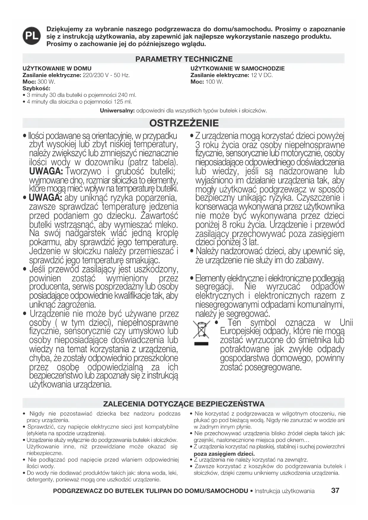 - Ten symbol oznacza w Unii Europejskiej odpady, które nie mogą zostać wyrzucone do śmietnika lub potraktowane jak zwykłe odpady gospodarstwa domowego, powinny zostać posegregowane. UŻYTKOWANIE W DOMUZasilanie elektryczne: 220/230 V - 50 Hz.Moc: 300 W.Szybkość:• 3 minuty 30 dla butelki o pojemności 240 ml.• 4 minuty dla słoiczka o pojemności 125 ml.UŻYTKOWANIE W SAMOCHODZIEZasilanie elektryczne: 12 V DC.Moc: 100 W. PARAMETRY TECHNICZNE Uniwersalny: odpowiedni dla wszystkich typów butelek i słoiczków.• Butelki lub słoiczki nie powinny być podgrzewane zbyt długo, może to prowadzić do rozwoju drobnoustrojów w mleku lub jedzeniu.