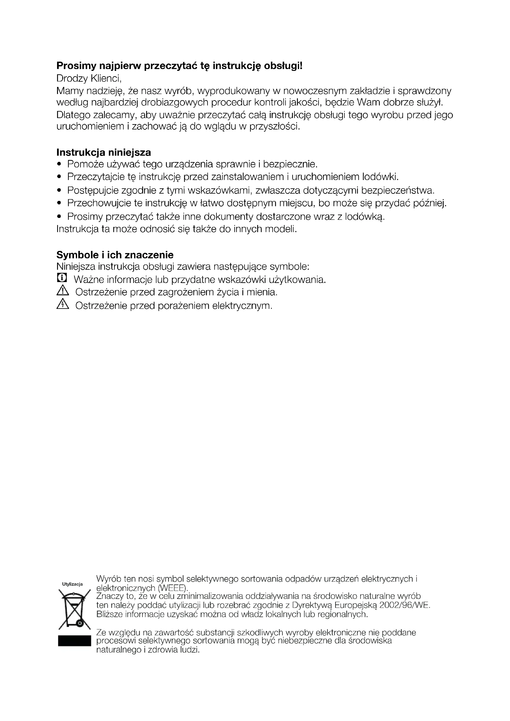 - Prosimy przeczytać także inne dokumenty dostarczone wraz z lodówką. Instrukcja ta może odnosić się także do innych modeli. Symbole i ich znaczenie Niniejsza instrukcja obsługi zawiera następujące symbole: C Ważne informacje lub przydatne wskazówki użytkowania. A Ostrzeżenie przed zagrożeniem życia i mienia. B Ostrzeżenie przed porażeniem elektrycznym. Wyrób ten nosi symbol selektywnego sortowania odpadów urządzeń elektrycznych i elektronicznych (WEEE). Znaczy to, że w celu zminimalizowania oddziaływania na środowisko naturalne wyrób ten należy poddać utylizacji lub rozebrać zgodnie z Dyrektywą Europejską 2002/96/WE. Bliższe informacje uzyskać można od władz lokalnych lub regionalnych. Ze względu na zawartość substancji szkodliwych wyroby elektroniczne nie poddane procesowi selektywnego sortowania mogą być niebezpieczne dla środowiska naturalnego i zdrowia ludzi. UtylizacjaPL