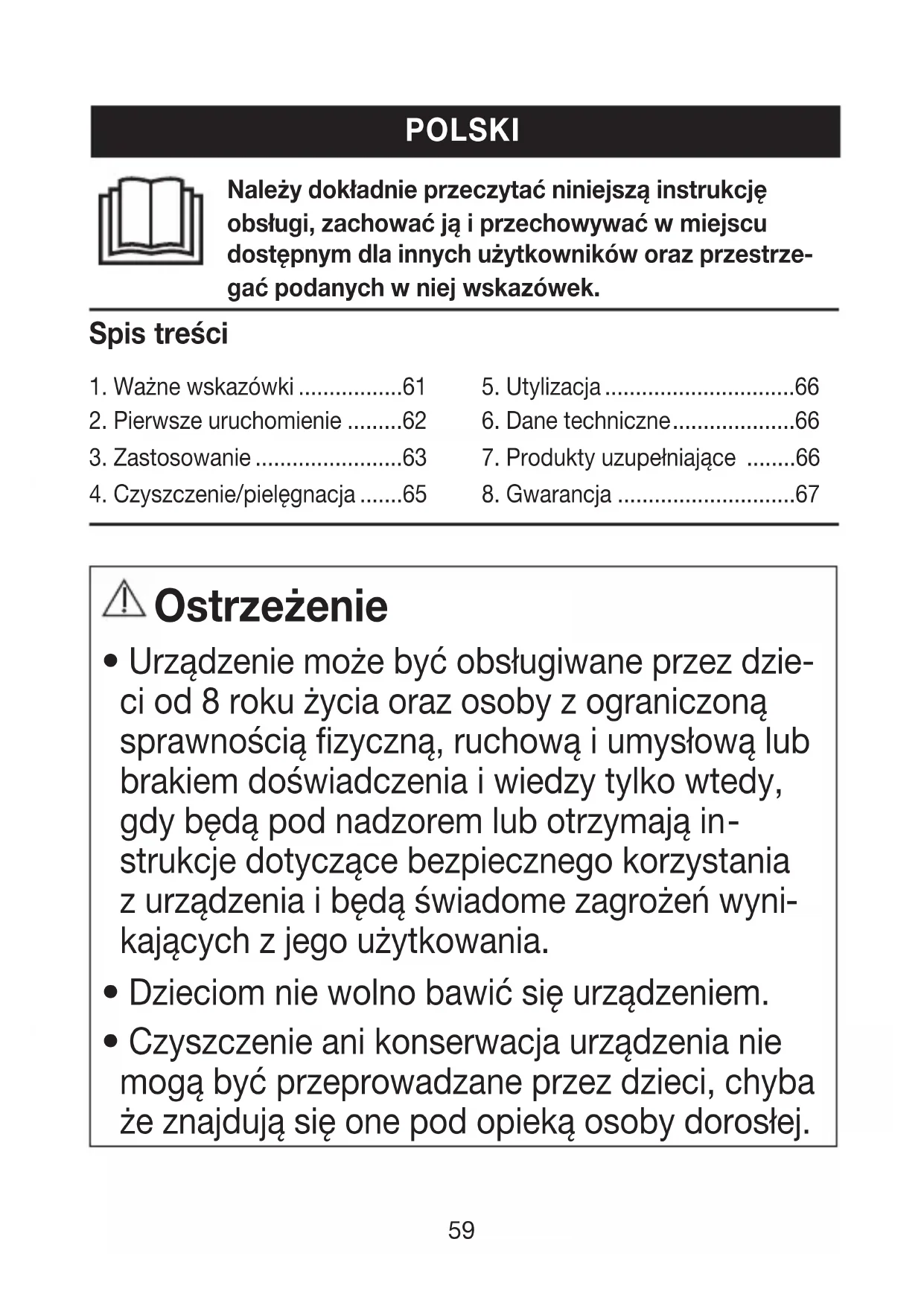 - Czyszczenie ani konserwacja urządzenia nie mogą być przeprowadzane przez dzieci, chyba że znajdują się one pod opieką osoby dorosłej. POLSKI Spis treści 1. Ważne wskazówki p. 612