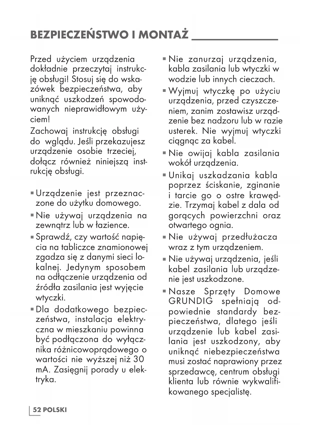 Nasze Sprzęty Domowe GRUNDIG spełniają od- powiednie standardy bez- pieczeństwa, dlatego jeśli urządzenie lub kabel zasi- lania jest uszkodzony, aby uniknąć niebezpieczeństwa musi zostać naprawiony przez sprzedawcę, centrum obsługi klienta lub równie wykwalifi- kowanego specjalistę.53 POLSKI Nieprawidłowa lub nieprofes- jonalna naprawa może spow- odować niebezpieczeństwo oraz zagrożenie dla użytkow- nika.