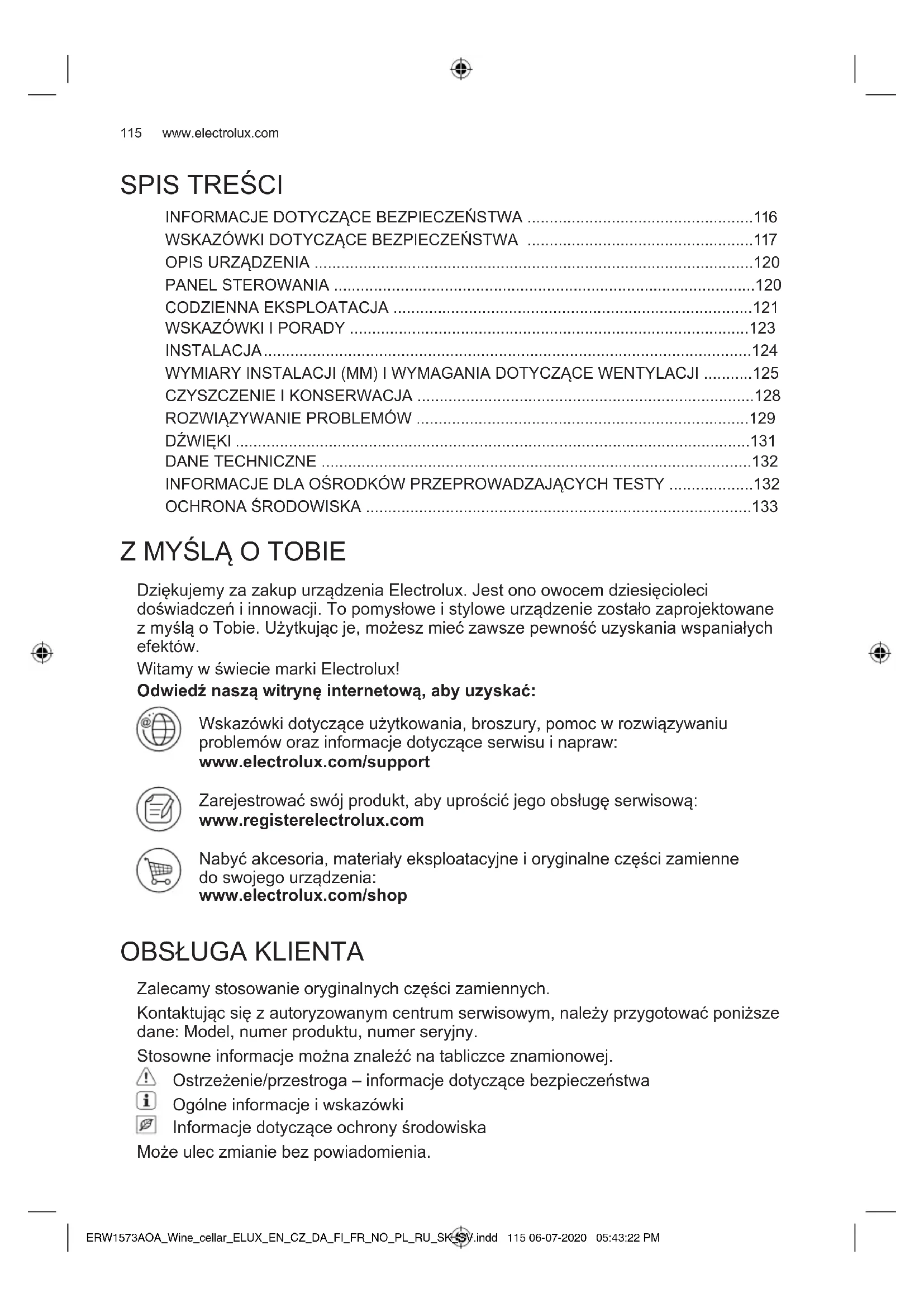 DziękujemyzazakupurządzeniaElectrolux.Jestonoowocemdziesięcioleci doświadczeńiinnowacji.Topomysłoweistyloweurządzeniezostałozaprojektowane zmyśląoTobie.Użytkującje,możeszmiećzawszepewnośćuzyskaniawspaniałych efektów. WitamywświeciemarkiElectrolux! Odwiedź naszą witrynę internetową, aby uzyskać: Wskazówkidotycząceużytkowania,broszury,pomocwrozwiązywaniu problemóworazinformacjedotycząceserwisuinapraw: www.electrolux.com/support Zarejestrowaćswójprodukt,abyuprościćjegoobsługęserwisową: www.registerelectrolux.com Nabyćakcesoria,materiałyeksploatacyjneioryginalneczęścizamienne doswojegourządzenia: www.electrolux.com/shop OBSŁUGAKLIENTA Zalecamystosowanieoryginalnychczęścizamiennych. Kontaktującsięzautoryzowanymcentrumserwisowym,należyprzygotowaćponiższe dane:Model,numerproduktu,numerseryjny. Stosowneinformacjemożnaznaleźćnatabliczceznamionowej. Ostrzeżenie/przestroga–informacjedotyczącebezpieczeństwa Ogólneinformacjeiwskazówki Informacjedotycząceochronyśrodowiska Możeuleczmianiebezpowiadomienia. ERW1573AOA_Wine_cellar_ELUX_EN_CZ_DA_FI_FR_NO_PL_RU_SK_SV.indd 115 06-07-2020 05:43:22 PM116 www.electrolux.com Przed przystąpieniem do instalacji i rozpoczęciem eksploatacji urządzenia należy uważnie zapoznać się z załączoną instrukcją obsługi. Producent nie odpowiada za uszkodzenia i obrażenia ciała spowodowane nieprawidłową instalacją i eksploatacją. Należy zachować instrukcję wraz z urządzeniem do wykorzystania w przyszłości. Bezpieczeństwo dzieci i osób o ograniczonych zdolnościach ruchowych, sensorycznych lub umysłowych