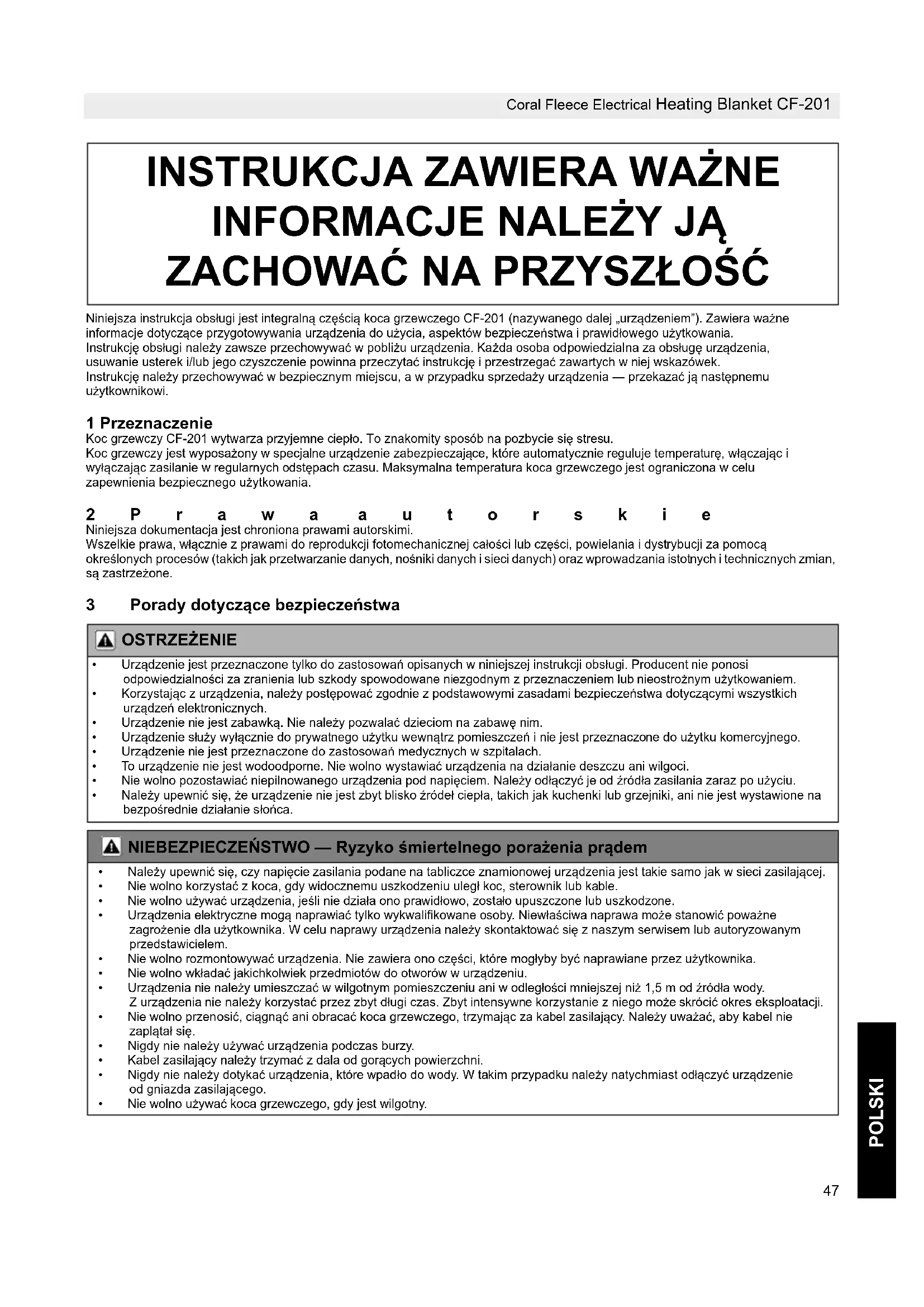 - Pokud je napájecí kabel poškozen, musí být vyměněn výrobce, jeho servisem nebo podobně kvalifikovanou osobou, aby se zamezilo jakémukoliv riziku. Tento výrobek splňuje základní požadavky a další píslušná ustanovení směrnice 2004/108/ES. Prohlášení o shodě je k dispozici na následující adrese: http://www.topcom.net/cedeclarations.asp47 Coral Fleece Electrical Heating Blanket CF-201 POLSKI Niniejsza instrukcja obsługi jest integralną częścią koca grzewczego CF-201 (nazywanego dalej „urządzeniem”). Zawiera ważne informacje dotyczące przygotowywania urządzenia do użycia, aspektów bezpieczeństwa i prawidłowego użytkowania. Instrukcję obsługi należy zawsze przechowywać w pobliżu urządzenia. Każda osoba odpowiedzialna za obsługę urządzenia, usuwanie usterek i/lub jego czyszczenie powinna przeczytać instrukcję i przestrzegać zawartych w niej wskazówek. Instrukcję należy przechowywać w bezpiecznym miejscu, a w przypadku sprzedaży urządzenia — przekazać ją następnemu użytkownikowi. 1 Przeznaczenie Koc grzewczy CF-201 wytwarza przyjemne ciepło. To znakomity sposób na pozbycie się stresu. Koc grzewczy jest wyposażony w specjalne urządzenie zabezpieczające, które automatycznie reguluje temperaturę, włączając i wyłączając zasilanie w regularnych odstępach czasu. Maksymalna temperatura koca grzewczego jest ograniczona w celu zapewnienia bezpiecznego użytkowania. 2Prawa autorskie Niniejsza dokumentacja jest chroniona prawami autorskimi. Wszelkie prawa, włącznie z prawami do reprodukcji fotomechanicznej całości lub części, powielania i dystrybucji za pomocą określonych procesów (takich jak przetwarzanie danych, nośniki danych i sieci danych) oraz wprowadzania istotnych i technicznych zmian, są zastrzeżone. 3 Porady dotyczce bezpieczestwa OSTRZEENIE