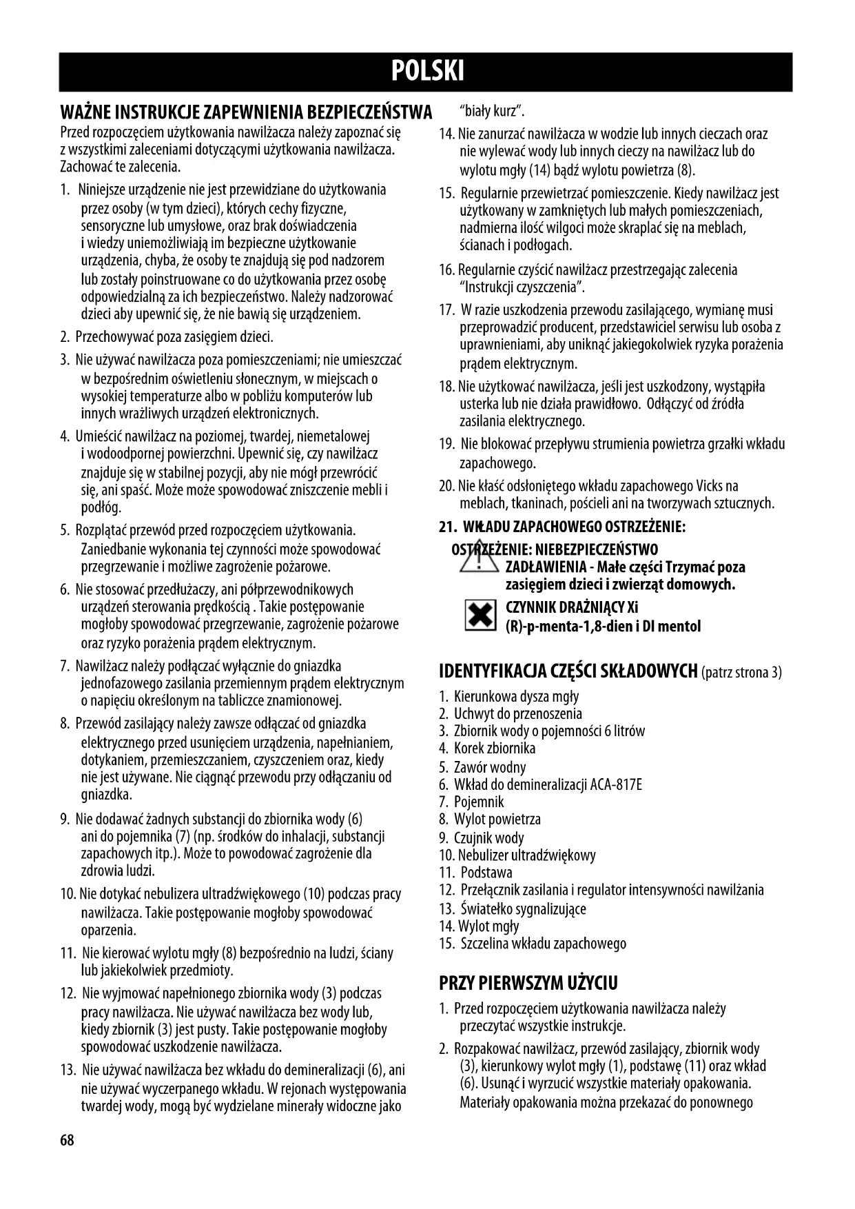 ani do pojemnika (7), bądź na wkład (6) (np. środków do inhalacji, substancji zapachowych itp.). Mogłoby to spowodować zagrożenie dla zdrowia.
