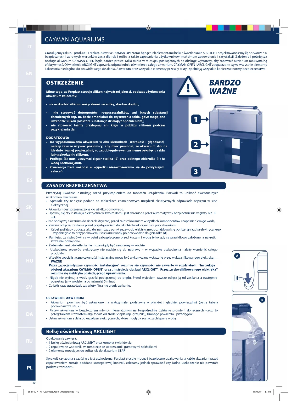 ENERGY etc.). Twój sprzedawca poinformuje cię o wszystkich szczegółach. W razie potrzeby, zasięgnij również jego rady odnośnie gatunków ryb, częstotliwości karmienia i rodzaju pokarmu.WAŻNETo urządzenie jest oznaczone zgodnie z Dyrektywą Europejską 2002/96/EC oraz polską Ustawą o zużytym sprzęcie elektrycznym i elektronicznym symbolem przekreślonego kontenera na odpady.Takie oznakowanie informuje, że sprzęt ten, po okresie jego użytkowania nie może być umieszczany łącznie z innymi odpadami pochodzącymi z gospodarstwa domowego. Użytkownik jest zobowiązany do oddania go prowadzącym zbieranie zużytego sprzętu elektrycznego i elektronicznego. Prowadzący zbieranie, w tym lokalne punkty zbiórki, sklepy oraz gminne jednostki, tworzą odpowiedni system umożliwiający oddanie tego sprzętu.CZĘŚCI ZAMIENNE I AKCESORIAKażdy element akwarium CAYMAN OPEN, belki oświetleniowej ARCLIGHT oraz filtra może być łatwo wymieniony. Każda część zamienna dostępna jest u sprzedawcy, u którego zakupiłeś niniejsze urządzenie. Aby zapewnić prawidłowe działanie urządzenia, stosuj wyłącznie oryginale części zamienne Ferplast. Stosowanie innych części powoduje utratę gwarancji.GWARANCJAFerplast udziela gwarancji na akwarium CAYMAN OPEN oraz belkę oświetleniową ARCLIGHT z ograniczeniami podanymi w niniejszej klauzuli i zgodnie z aktualnie obowiązującym prawem. Gwarancja obejmuje wyłącznie wady powstałe w procesie produkcji i obejmuje bezpłatną naprawę lub wymianę. Gwarancja nie obejmuje uszkodzeń powstałych w wyniku: niedbałości bądź nieuwagi użytkownika, użytkowania niezgodnie z przeznaczeniem lub niezgodnie z uwagami zamieszczonymi w niniejszej instrukcji, wypadku, manipulowania przy urządzeniu oraz nieprawidłowej naprawy. Gwarancja jest ważna wyłącznie z dołączonym rachunkiem zakupu. Gwarancja nie obejmuje elementów eksploatacyjnych: świetlówek, startera, gąbek ani innych wkładów filtracyjnych. Zastosowanie nieoryginalnych części zamiennych unieważnia gwarancję. 363140-4_FI_CaymanOpen_Arclight.indd 42363140-4_FI_CaymanOpen_Arclight.indd 42 15/09/11 17.0415/09/11 17.0443 363140-4_FI_CaymanOpen_Arclight.indd 43363140-4_FI_CaymanOpen_Arclight.indd 43 15/09/11 17.0415/09/11 17.04www.ferplast.com info@ferplast.com 363140-4 363140-4_FI_CaymanOpen_Arclight.indd 44363140-4_FI_CaymanOpen_Arclight.indd 44 15/09/11 17.0415/09/11 17.04